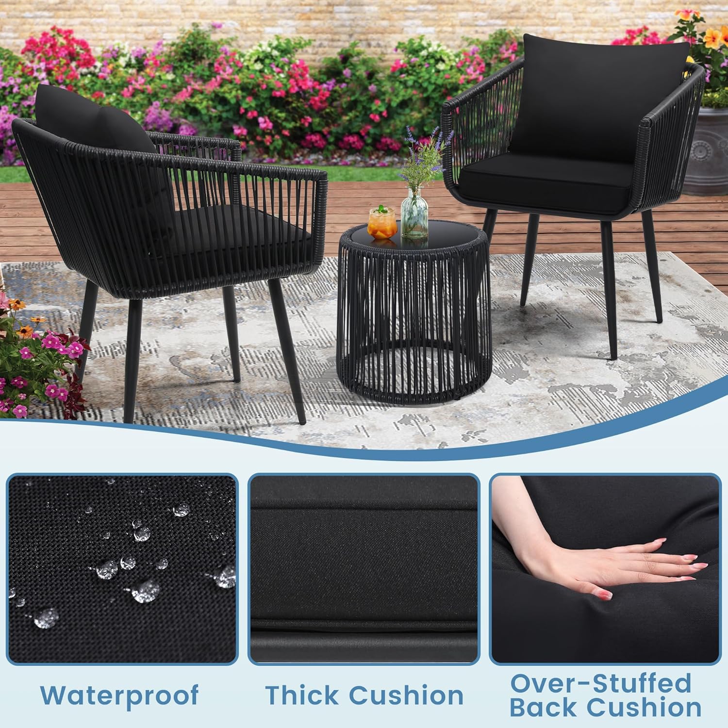 - ćWHATS INCLUDEDć Each 3 pieces bistro conversation set includes 4 overstuffed waterproof zippered cushions, 1 cocktail table with a tempered glass top, and 2 boho style indoor outdoor chairs.