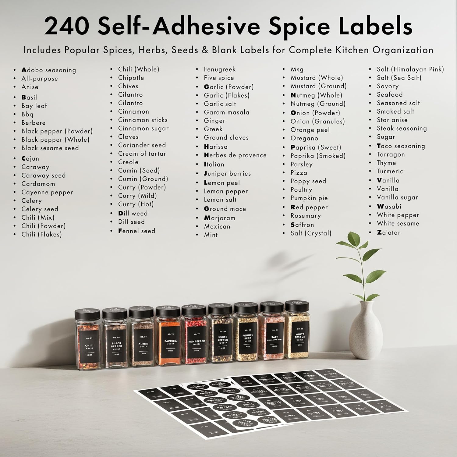 - PREMIUM LABELS: Our spice labels are made from a thicker, high-quality material for increased durability. The clean dark color adds a sophisticated and polished look to your kitchen or pantry.