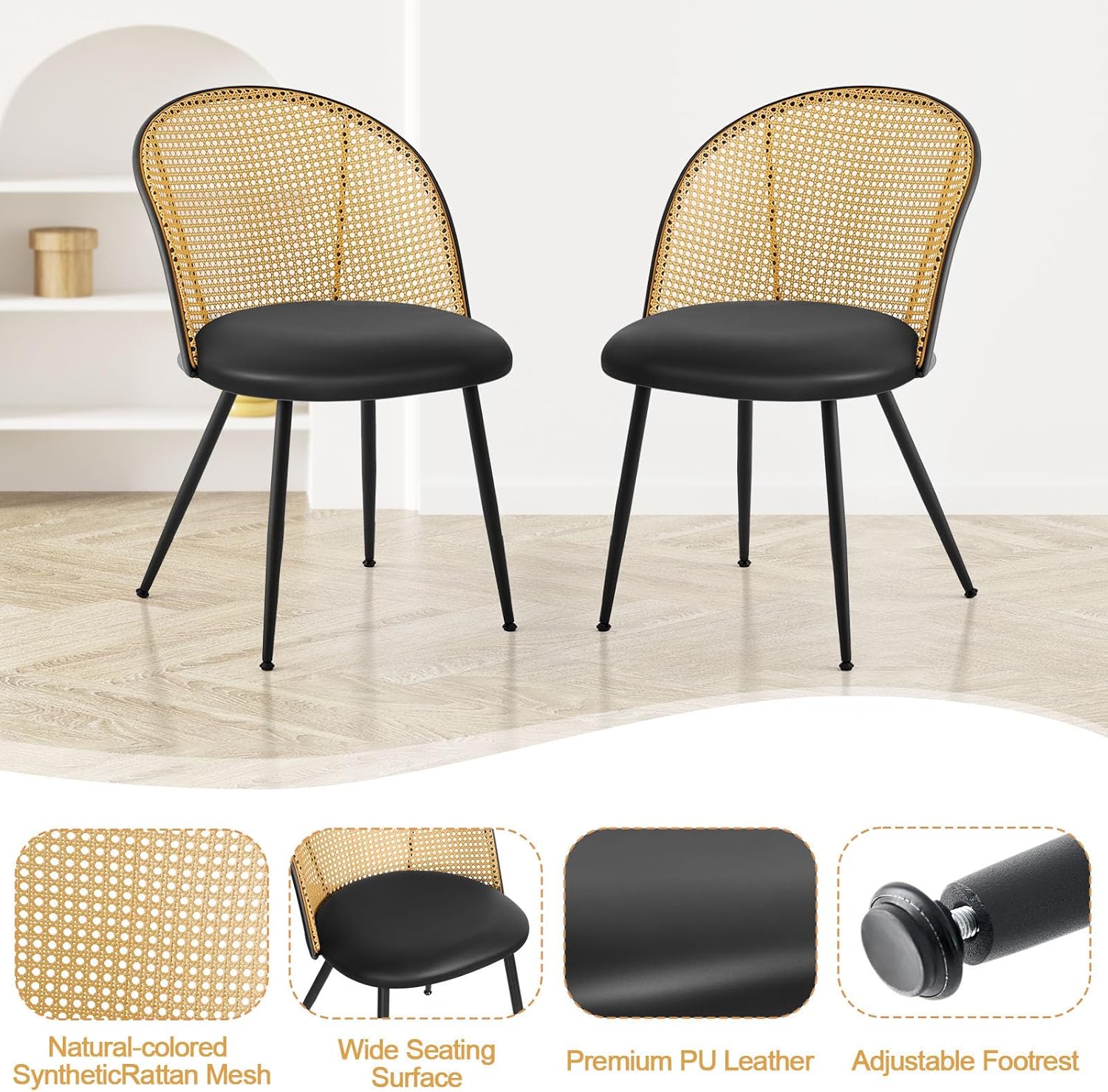 - 【Modern Mid-Century Style】: These dining chairs boast the sleek and timeless design of mid-century aesthetics. Powered-coated black metal legs provide a touch of contemporary elegance, while the exquisitely crafted rattan hollow back provides a delicate accent of natural beauty. This design evokes classic charm and creates an idyllic atmosphere.