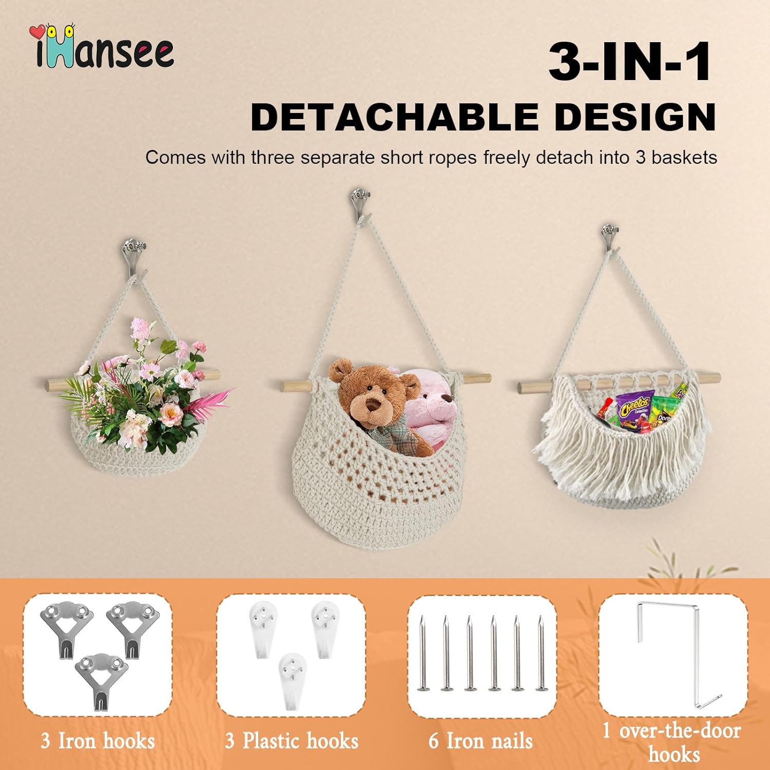 - 【Easy to Install】 Installation is a breeze, requiring just three simple steps and no assembly. Just hammer/nail, hang, and done! Equipped with 1 over the door hook, 3 hidden hooks, 3 metal hook and 6 metal screws(drill holes for installation). These hanging baskets for organizing make excellent gifts for birthdays, holidays, and housewarmings.