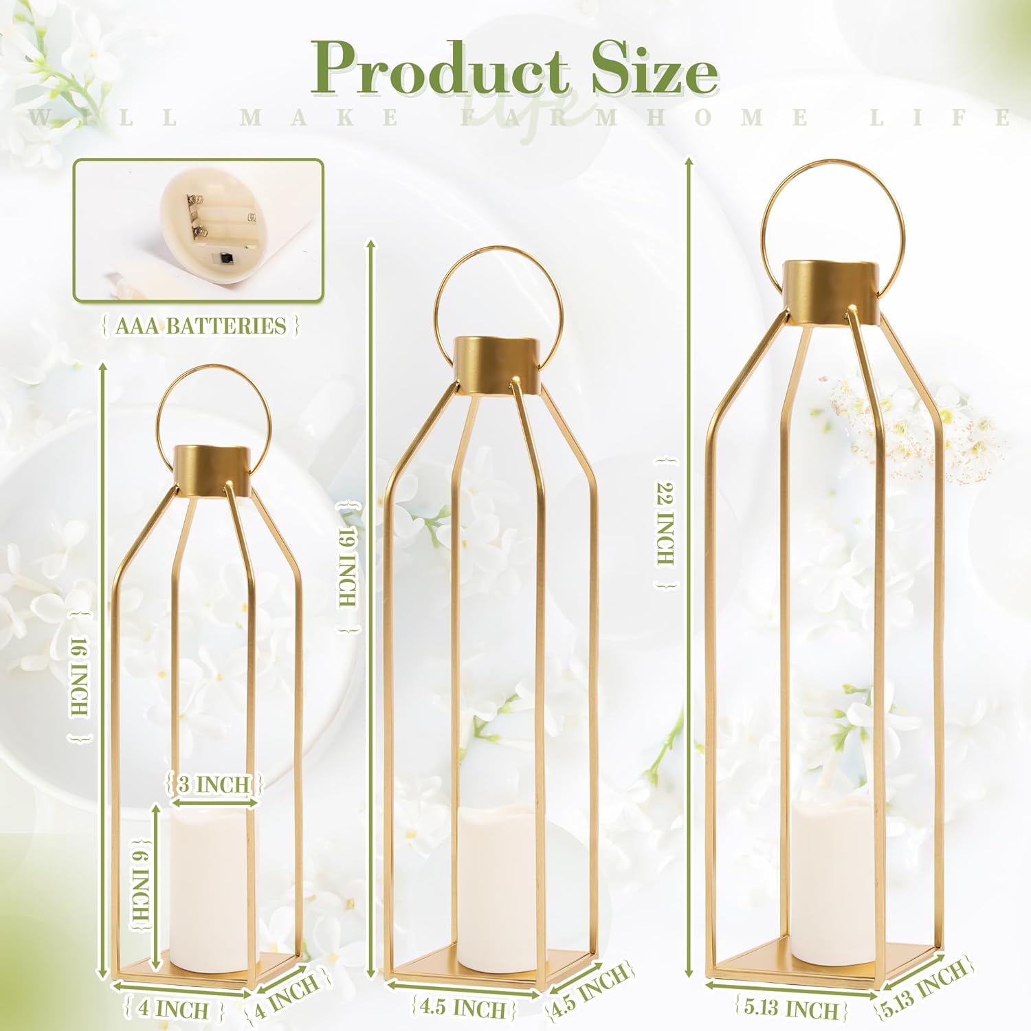 - 【Dimensions】:Our decorative candle lanterns are elegantly crafted of sturdy gold metal frame. They are great lanterns decor for indoors and outdoors. Including the handle, the larger one measures 5.13 x 5.13 x 22 inch, the medium one measures 4.5 x 4.5 x 19 inch, the small one measures 4 x 4 x 16 inch. The included 3 LED candles measure 3 x 6 inch. Each candle requires 3 AAA batteries(NOT included).