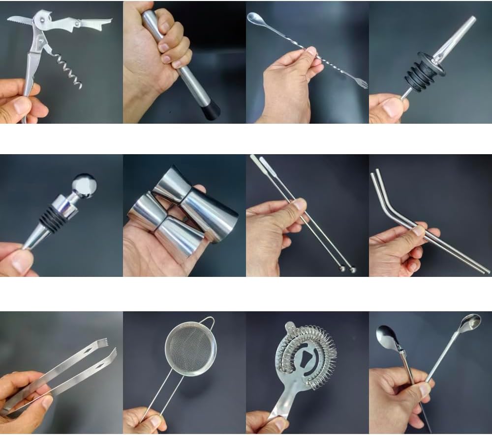 - Included Components : 22-Piece Bartender Tool Kit Includes:1*25/20 oz Black Shaker Cup,1*25/50ml Jigger,1*15/30ml Jigger,1*ice Strainer, 1*colander, 1*ice tongs, 1*muddler, 1*fork&spoon, 1*corkscrew, 2*mixing rod, 2*straw spoon, 2*curved straw, 4*pourer, 2*wine stopper, 1*Recipes Booklet, 1*black arylic stand. 22-Piece Bartender Tool Kit Includes:1*25/20 oz Black Shaker Cup,1*25/50ml Jigger,1*15/30ml Jigger,1*ice Strainer, 1*colander, 1… See more