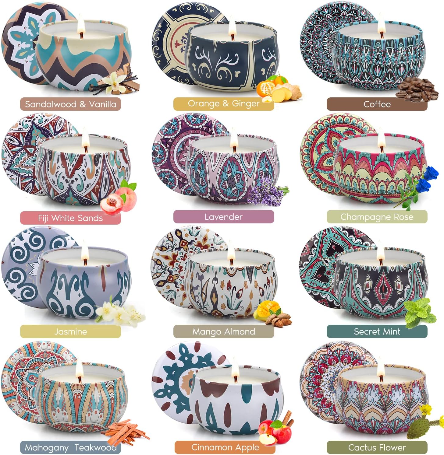 - ✅Scented Candles Gift Set - Contains 12 Scents: Champagne Rose, Vanilla, Orange, Coffee, White Peach Sandalwood, Lavender, Jasmine, Mango Almond, Secret Mint, Mahogany Teakwood, Cinnamon Apple, Cactus Flower.