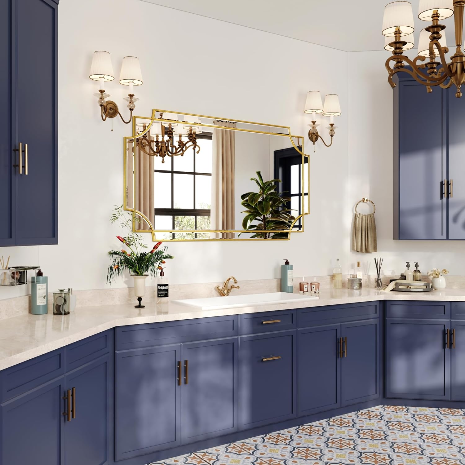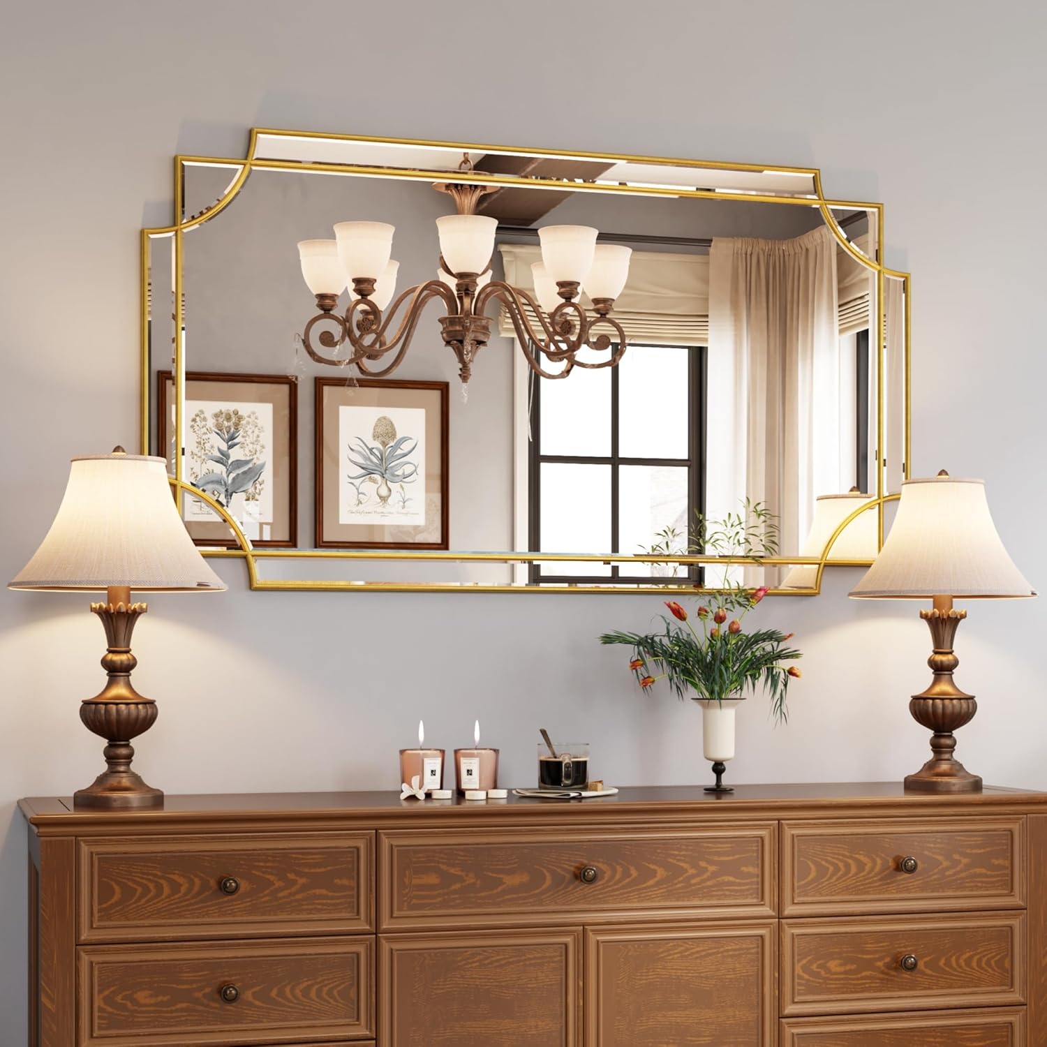 - UNTIQUE DESIGN. If your want some intricacies/interest to the pattern - not just a simple round or rectangle, this mirror will definitely be your perfect choice. Its sophisticated cutout corner accents along the inner and outer edges of the frame complete the look with added decorative detail. It will be a beautiful addition to any wall and an essential element in your home decor.