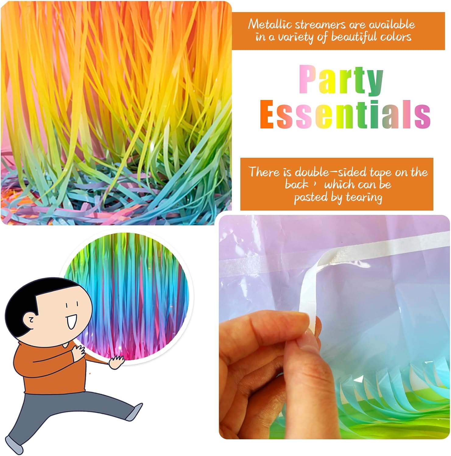 - Rainbow Birthday Decorations:3 packs rainbow streamers, the size of the foil curtain is 3.28 ft x 6.56 ft.It's long enough to fit any occasion. Please do not stick the foil curtain on uneven or stained walls to prevent it from falling off.