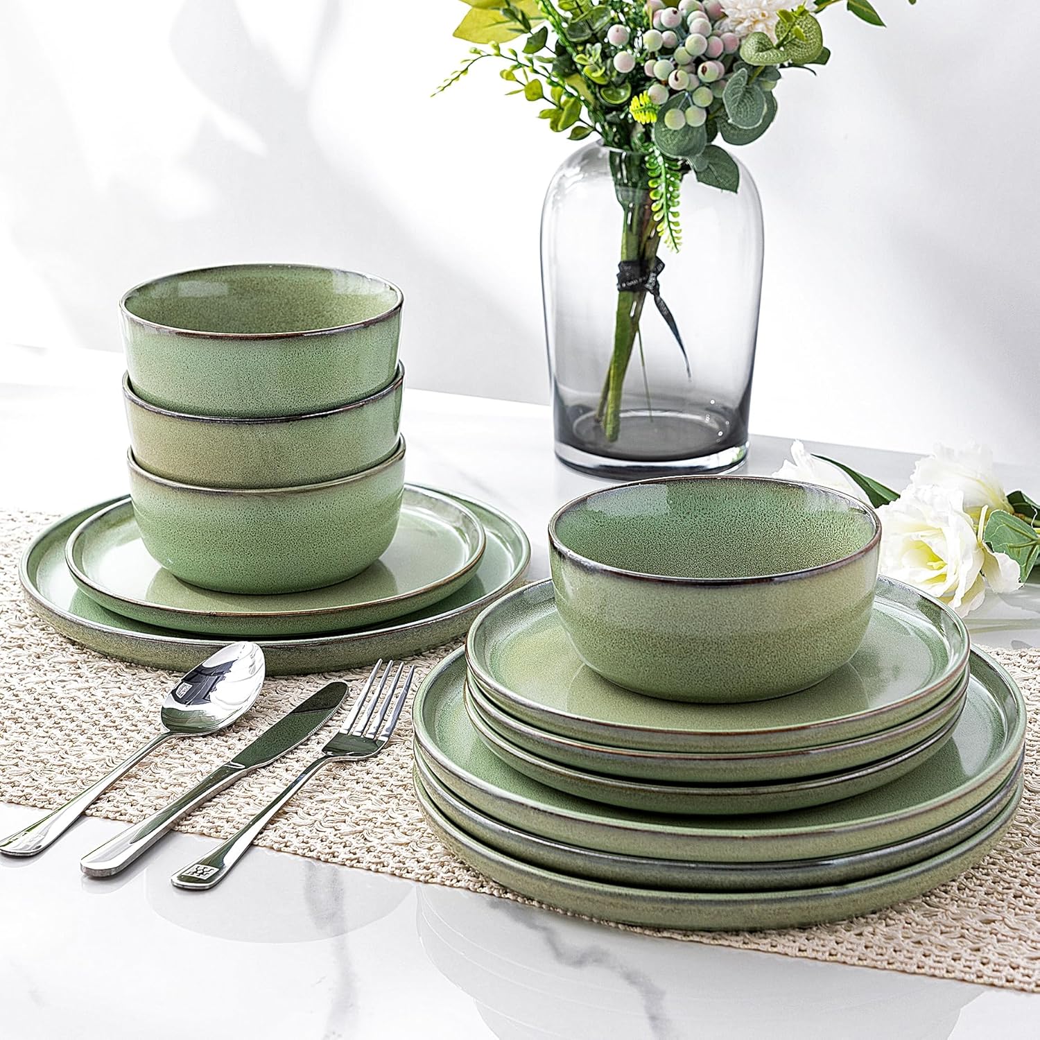 GBHOME Ceramic Dinnerware Sets for 4, 12 Pieces Stoneware Plates and Bowls Sets, Scratch Resistant Dishes, Dishwasher & Microwave Safe-Pastel Green