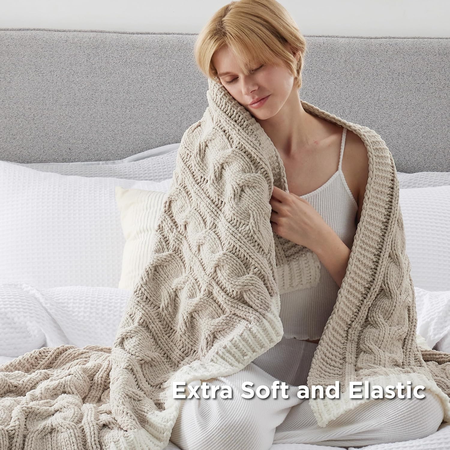 Bedsure Cable Knit Twin Blanket for Couch Bed - Breathable Chenille Chunky Knit Twin Blanket for Decorative Gift, GentleSoft Cozy and Warm for Winter and All Seasons, Beige, 60x80 Inches