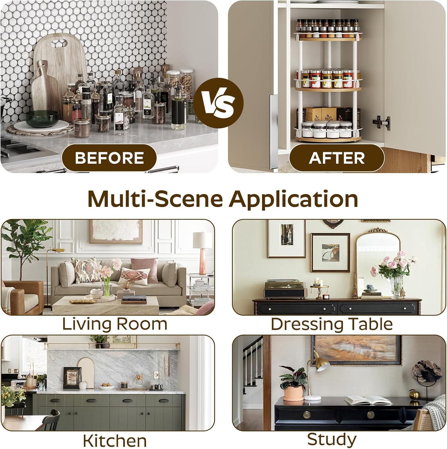 - Reduce Countertop Pressure: It is multifunctional. On the kitchen countertop, it keeps spice jars close at hand to make cooking fun. On the vanity table, it holds your beloved pieces. At the dinner table, you can easily "spin" to get your favorite