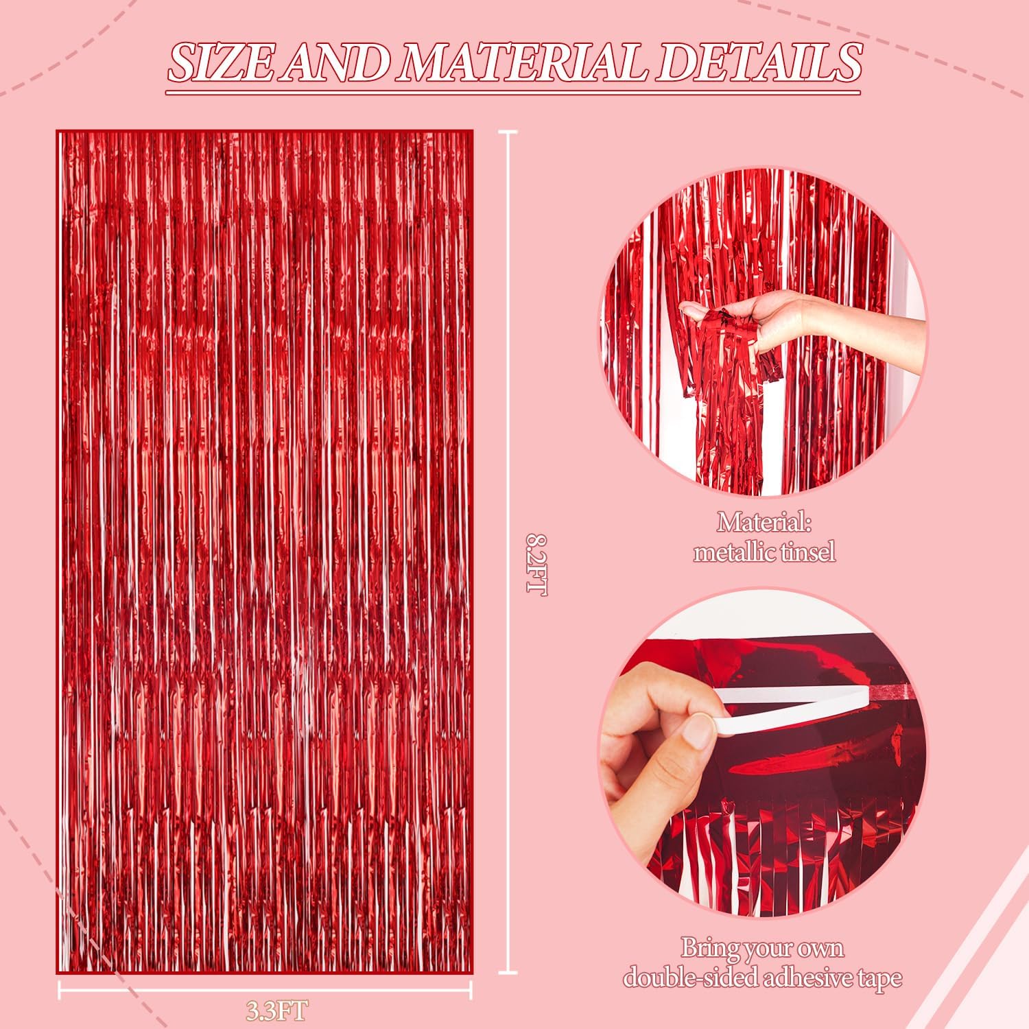 - 【3 Sets of Foil Fringe Curtains】Each package includes 3 sets of 3.3x8.2 ft foil fringe curtains, providing enough length to decorate your party with ease. Perfect for creating a stunning backdrop for any occasion.