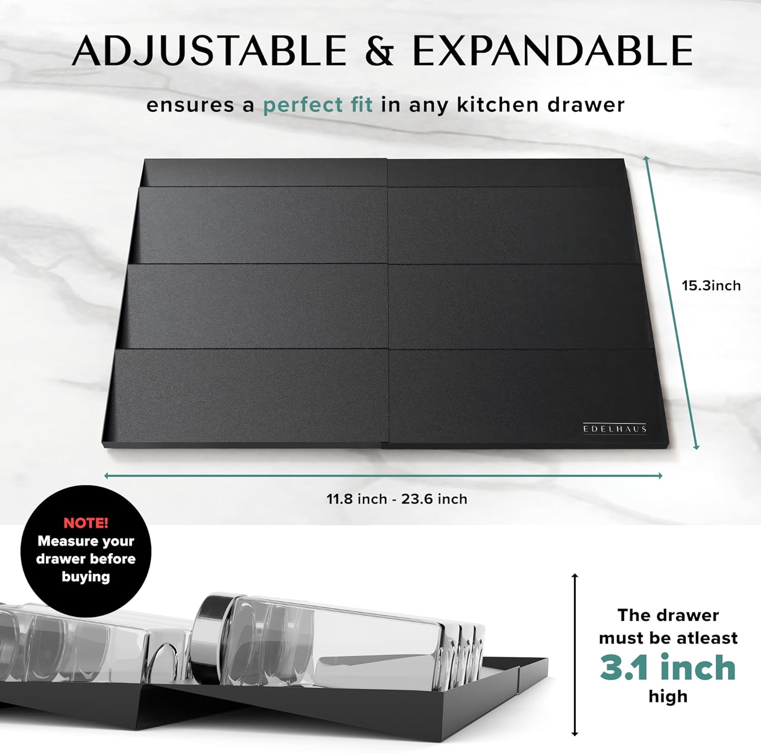 - IMPORTANT NOTICE - This black spice drawer organizer needs at least 3 inches deep drawer space to fit in when you add jars on; PLEASE MAKE SURE YOUR DRAWER IS AT LEAST 3" DEEP