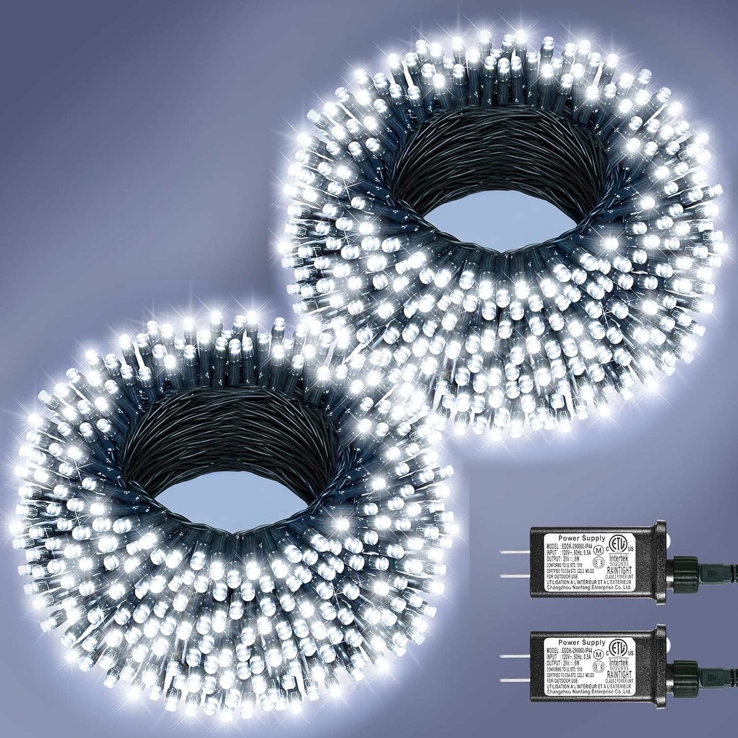 2 Pack Christmas Lights Outdoor, Total 200FT 600LED Christmas Tree Lights with 8 Modes Waterproof, Green Wire String Twinkle Lights for Indoor House Patio Yard Party Xmas Decorations, White