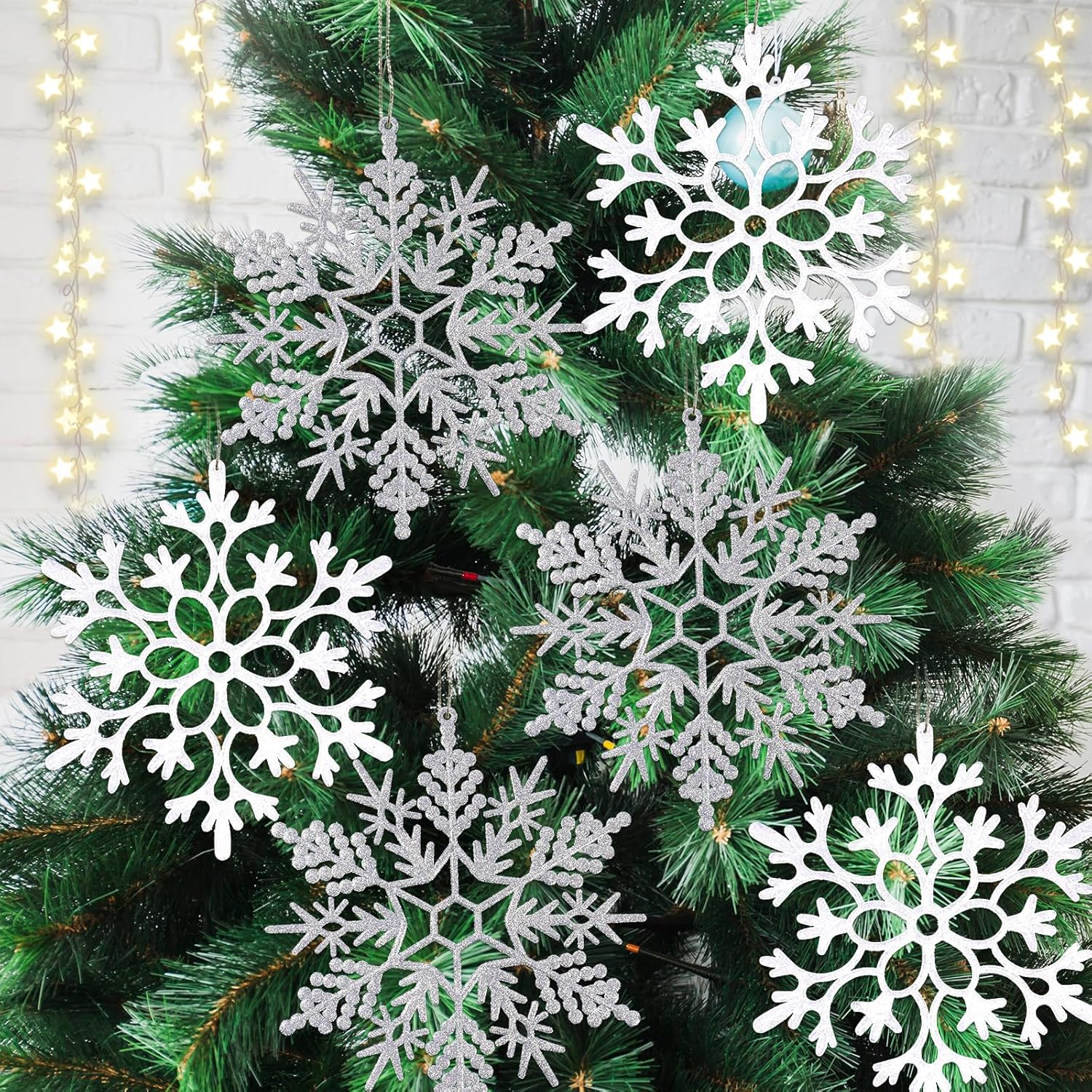 - SNOWFLAKES FOR CHRISTMAS: Featuring sparkly glitters on the surface, these white silver glitter snowflakes tree ornaments add much more sparkle to your Christmas tree decorations, they also look gorgeous on windows, ceiling, fireplace, outside yard, porch etc, perfect winter decorations snowflakes; Besides, they are excellent for frozen theme birthday party, winter wonderland birthday party decorations