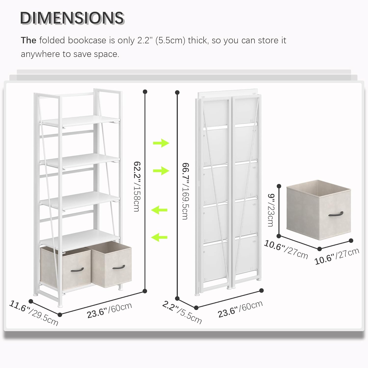 4NM No Assembly Foldable Bookshelf, 5-Shelf Collapsible Bookcase Storage for Small Spaces, 62.2" H, All White