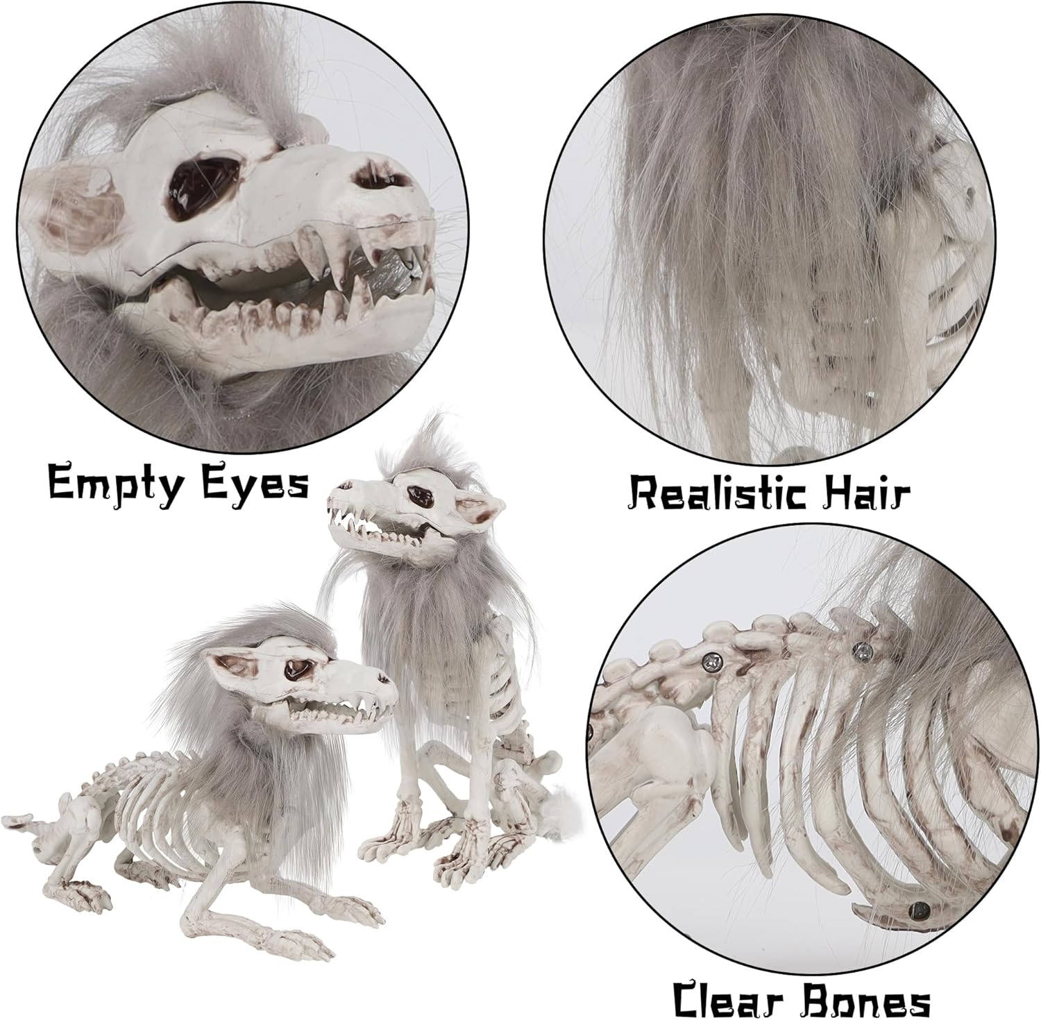 - Realistic Design: Our skeleton wolves feature an impressive bone structure and highly realistic gray fur, complete with hollow eyes and sharp teeth. They appear to be whispering or growling, adding a truly creepy element to your Halloween decor.