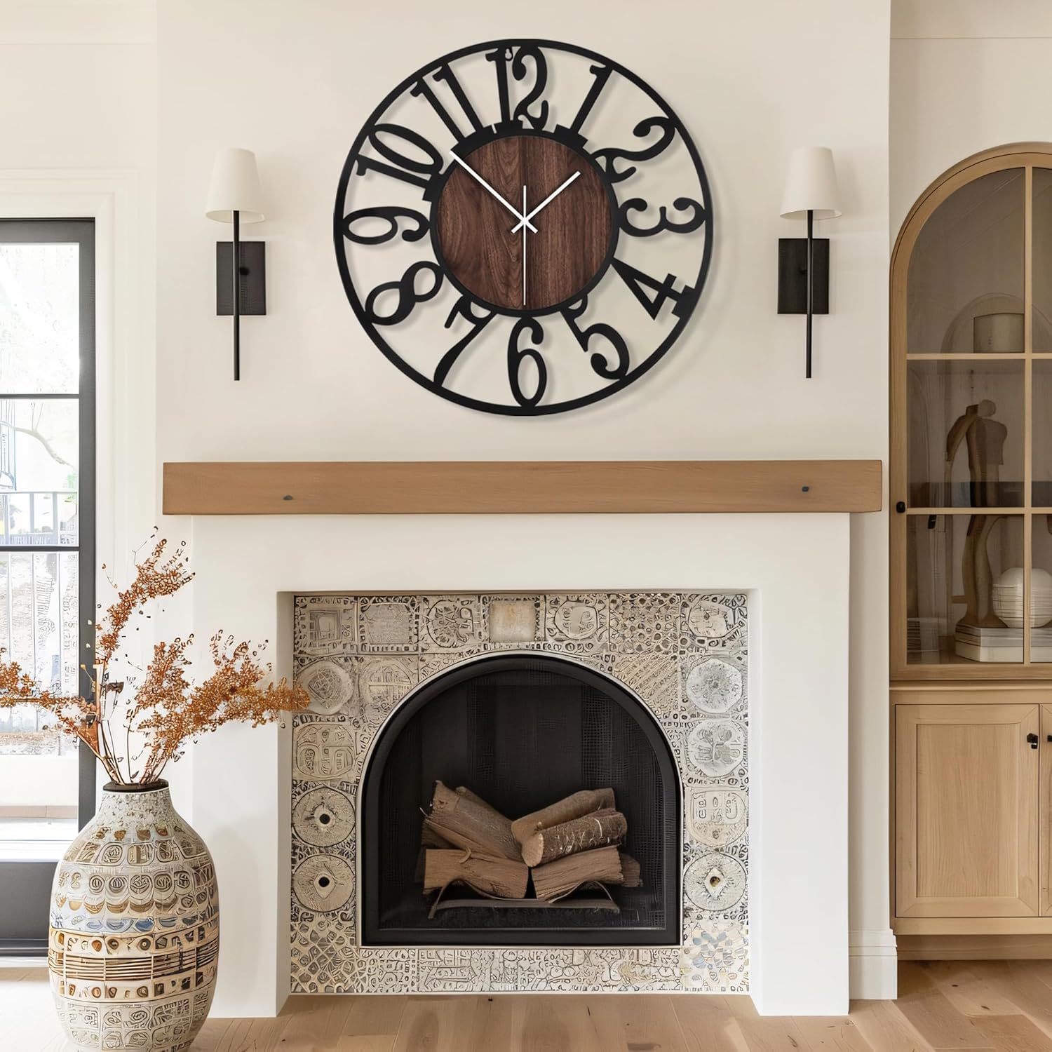 Maxstar Large Round Wall Clock for Living Room Decor Battery Operated Non Ticking Black Metal Wood Clocks for Home Living Room Garden Farmhouse Office Kitchen Decoration -32 inch