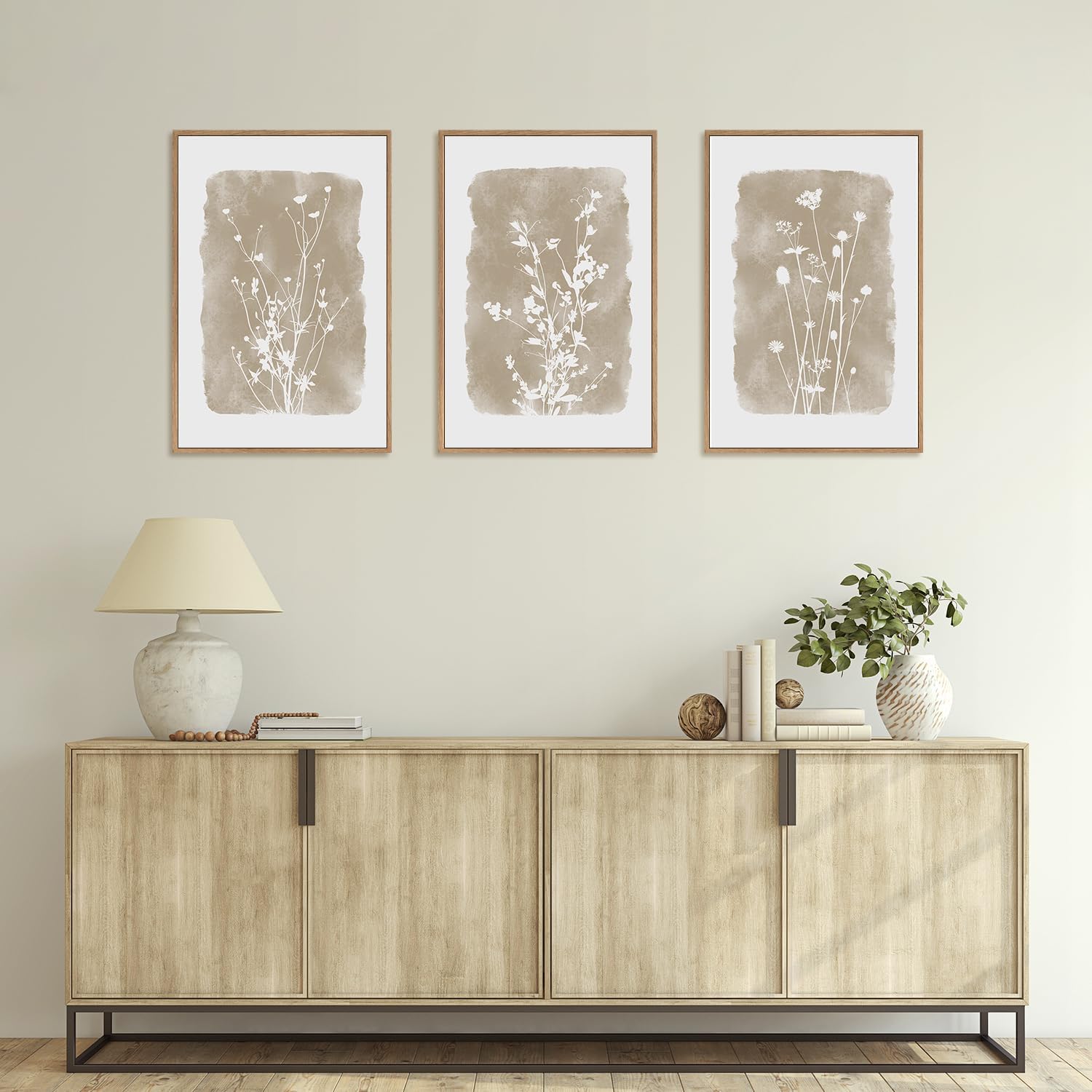 HPINUB Large Boho Wildflowers Canvas Framed Wall Art Set,Minimalist Vintage Flower Wall Decor,Beige Floral Botanical Artwork for Living Room Bedroom,Dining Room,Office -16"x24"x3