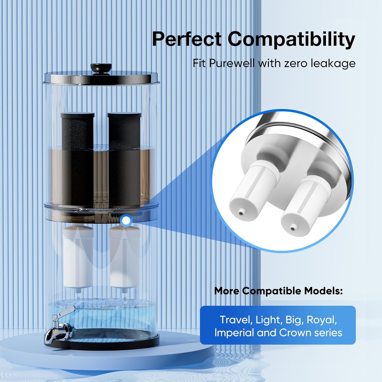- [Compatible Models] The Purewell 3-Stage Alkaline Filters can be additional filters for Berkey Black Filters, Travel, Big, Royal, Imperial, Light, Crown Berkey Series. It serves as the additional filter for the Purewell gravity water filtration system. Thanks to its exquisite design, this filter achieves great fit and no leakage. The water filter is not sourced by or sponsored by Berkey. Purewell is an independent brand.