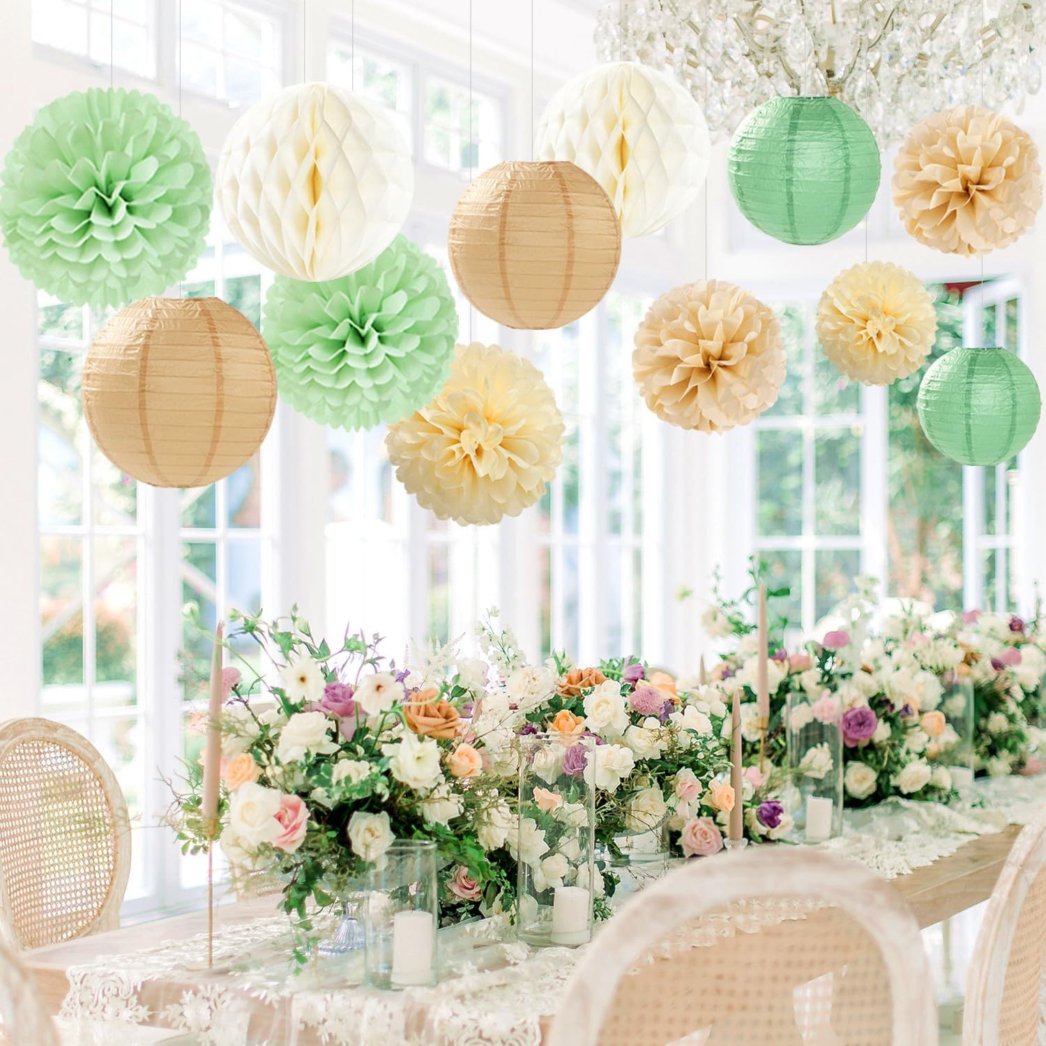 - 【Wide Use】These paper lanterns and pom poms are great for indoor and outdoor events such as safari baby shower decorations,boho bridal shower neutral,rustic wedding decor,sage green birthday,graduation,bachelorette,jungle theme party.