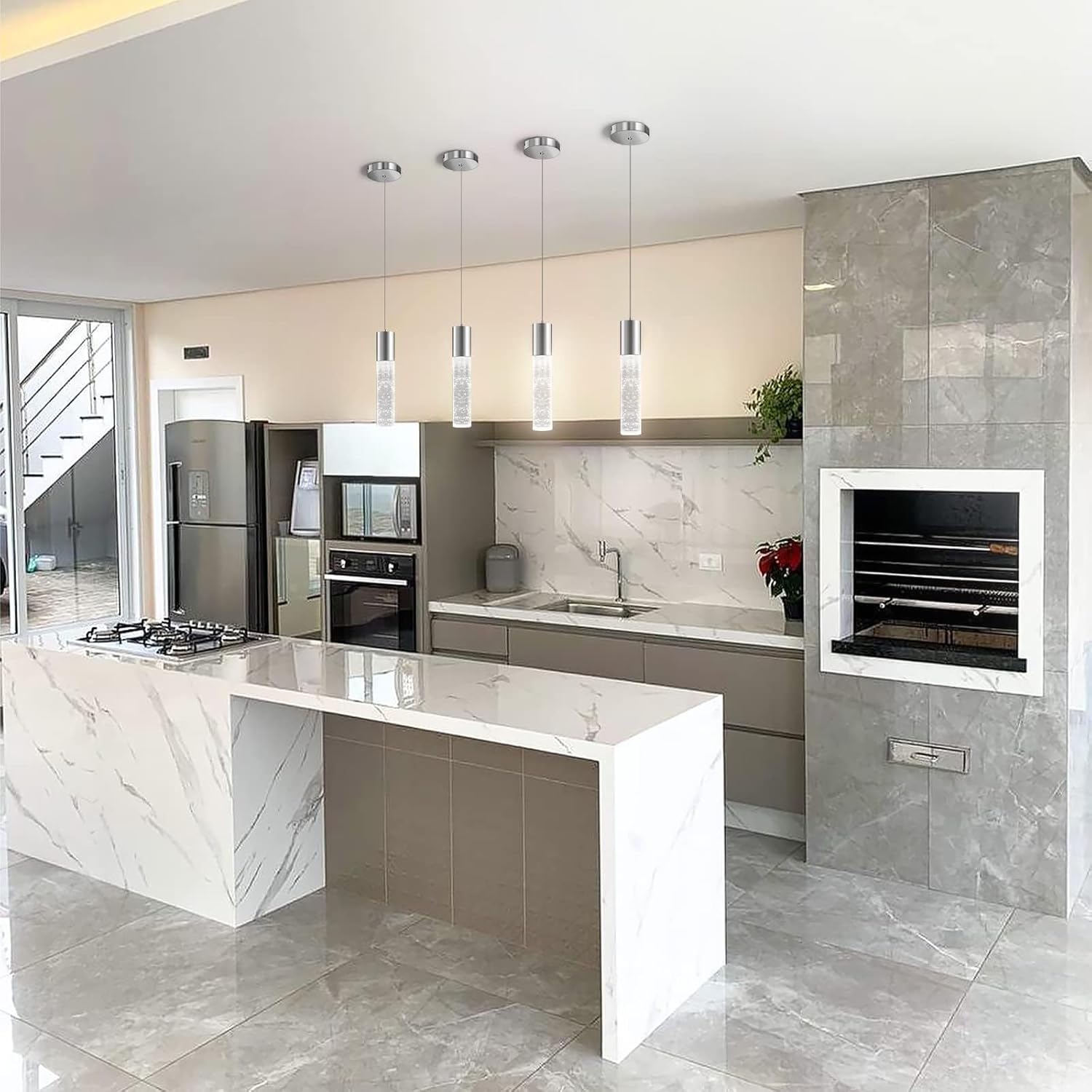 - [Simple modern style]: Modern pendant light stainless steel sconces and cylindrical crystal bubble lamp posts will add more luxury, noble, and artistic atmosphere to your home, let your island light add a high-end atmosphere to your kitchen.