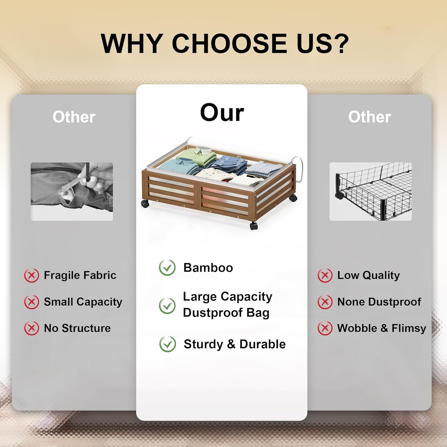 - ✅【Sturdy Under Bed Storage】:Our underbed storage units are built to last with high-quality 100% Real Bamboo,Beautiful appearance compared,oasting 4 rotating wheels with capacity of 120lbs, 48L large capacity dustproof cover bags hile the load-bearing capacity and durability are dramatically increased ,It's a versatile storage solution that can be customized based on your needs.