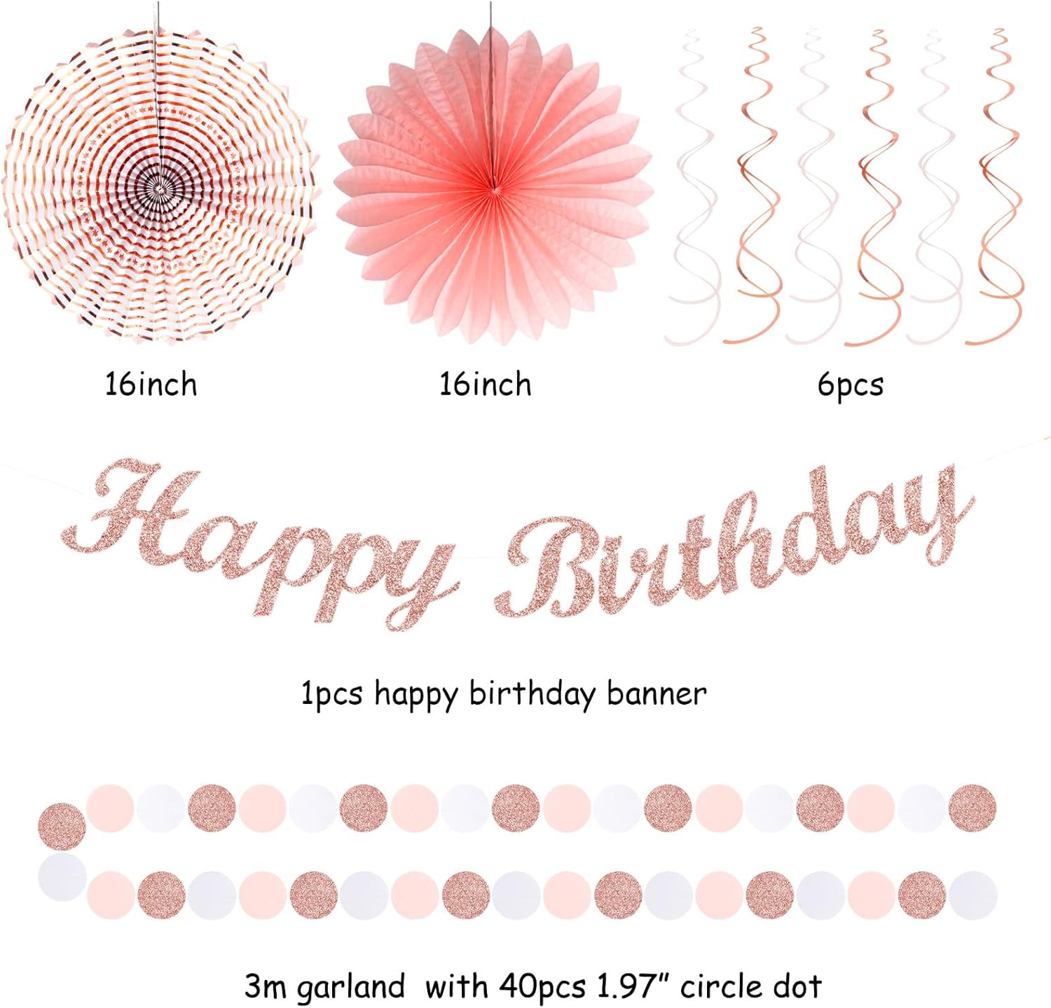- 【Rose gold Light Pink White Party Decorations kits】This kits include 1pcs happy birthday banner, 1pcs circle dots paper banner, 4pcs tissue flower pom poms: 3pcs 10" and 1pcs 12" , 3pcs 8inch paper honeycom ball, 2pcs 8inch paper lantern, 4pcs 12inch paper fan, 6pcs Paper swirls hanging streamers