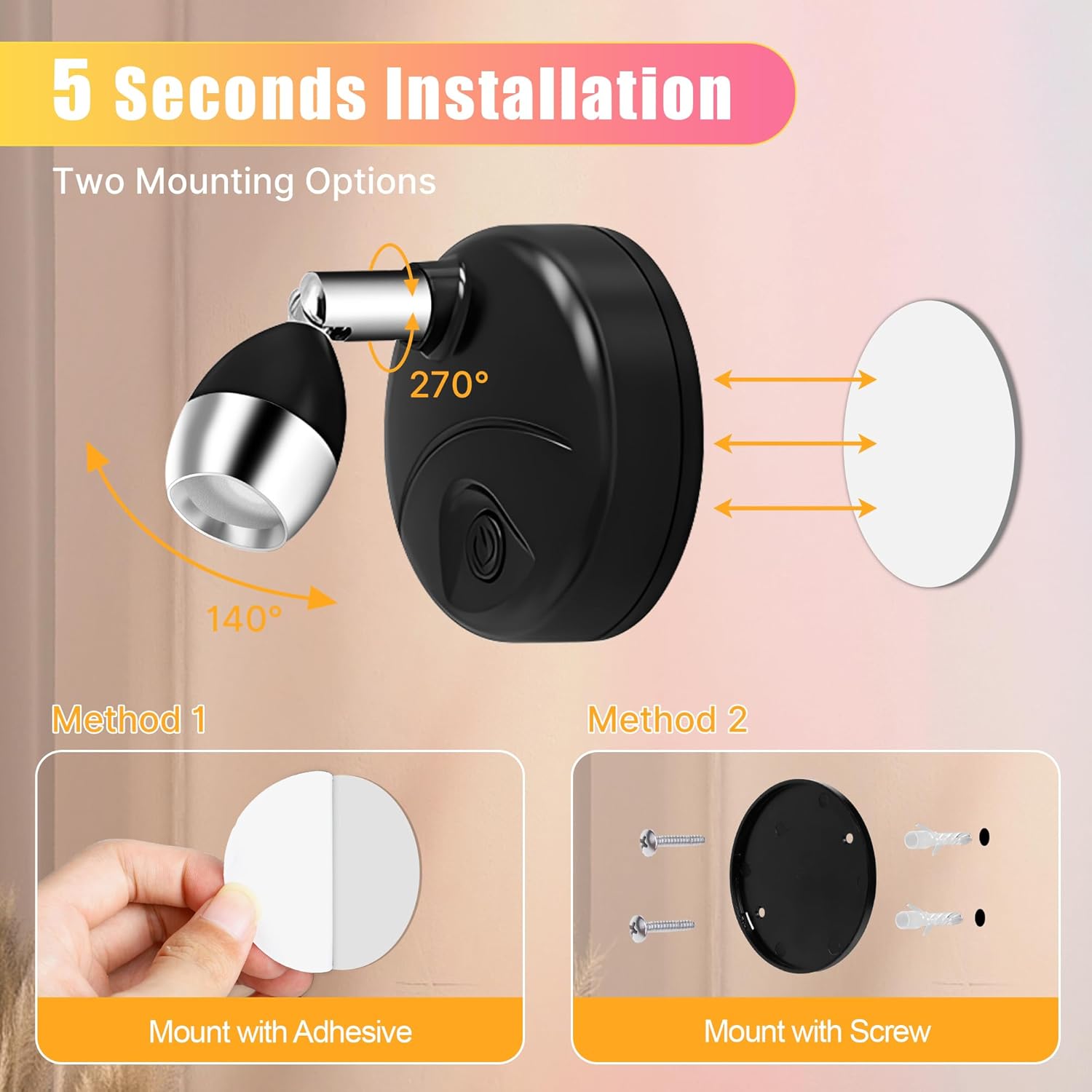 - Multi-Purpose Installation: This led spotlight indoor offers a tools-free installation process. Equipped with a magnetic mount and robust adhesive, it adheres easily to clean and smooth surfaces like walls or ceilings. Illuminate your closet, bookcase, decorations, wreath, art, and more with ease – a versatile solution for various applications.