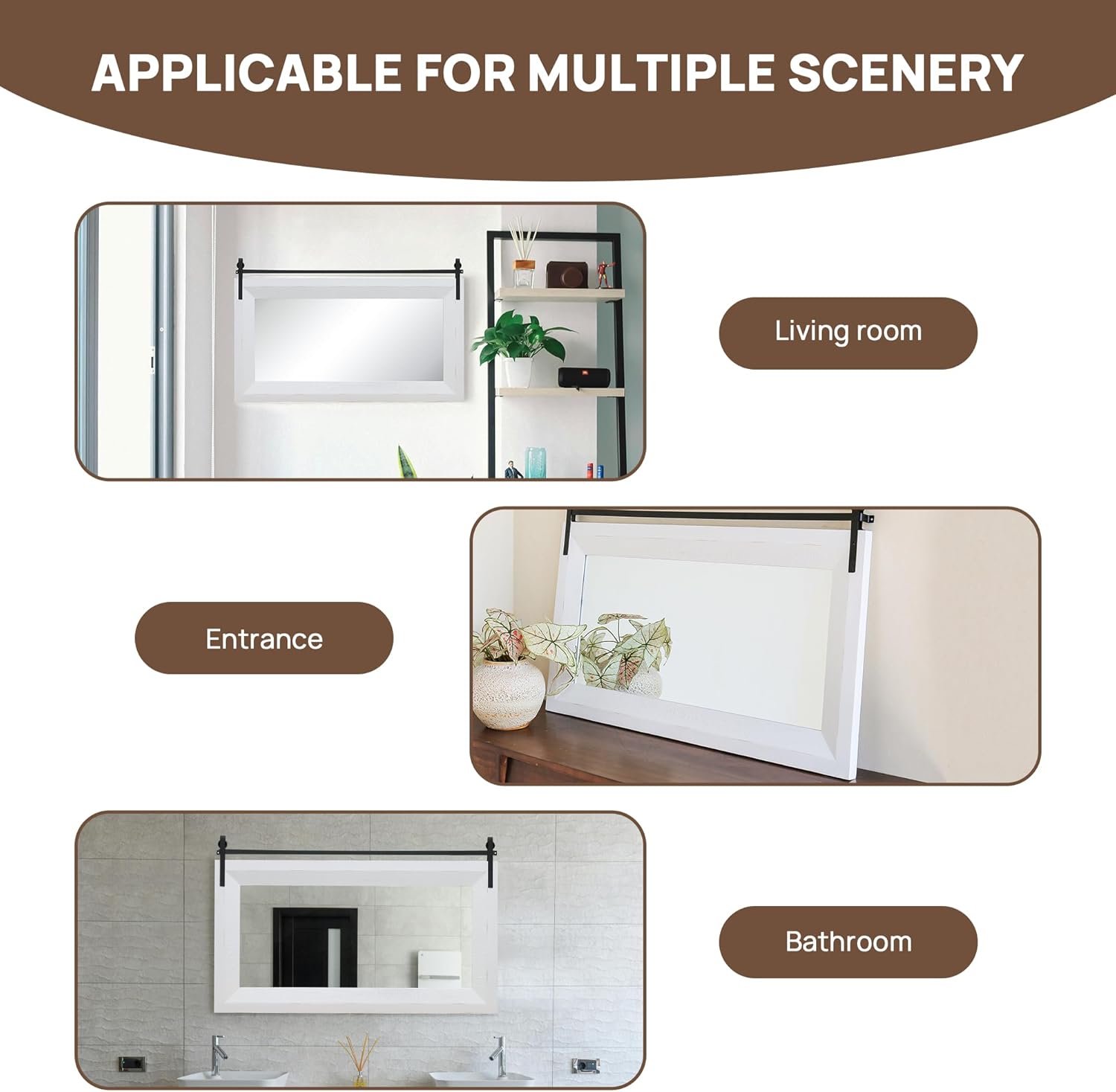 - ćPremium Solid Wood FramećThe frame of the farmhouse mirror is made of premium fir wood with oil-based paint to prevent scratches and ensure durability and resistance to moisture. The solid wood frame gives the rustic mirror a sturdy and authentic look, adding a touch of farmhouse appeal to the bathroom, living room, powder room, entryway, hallways, bedroom, dressing room, garden, courtyard, etc.
