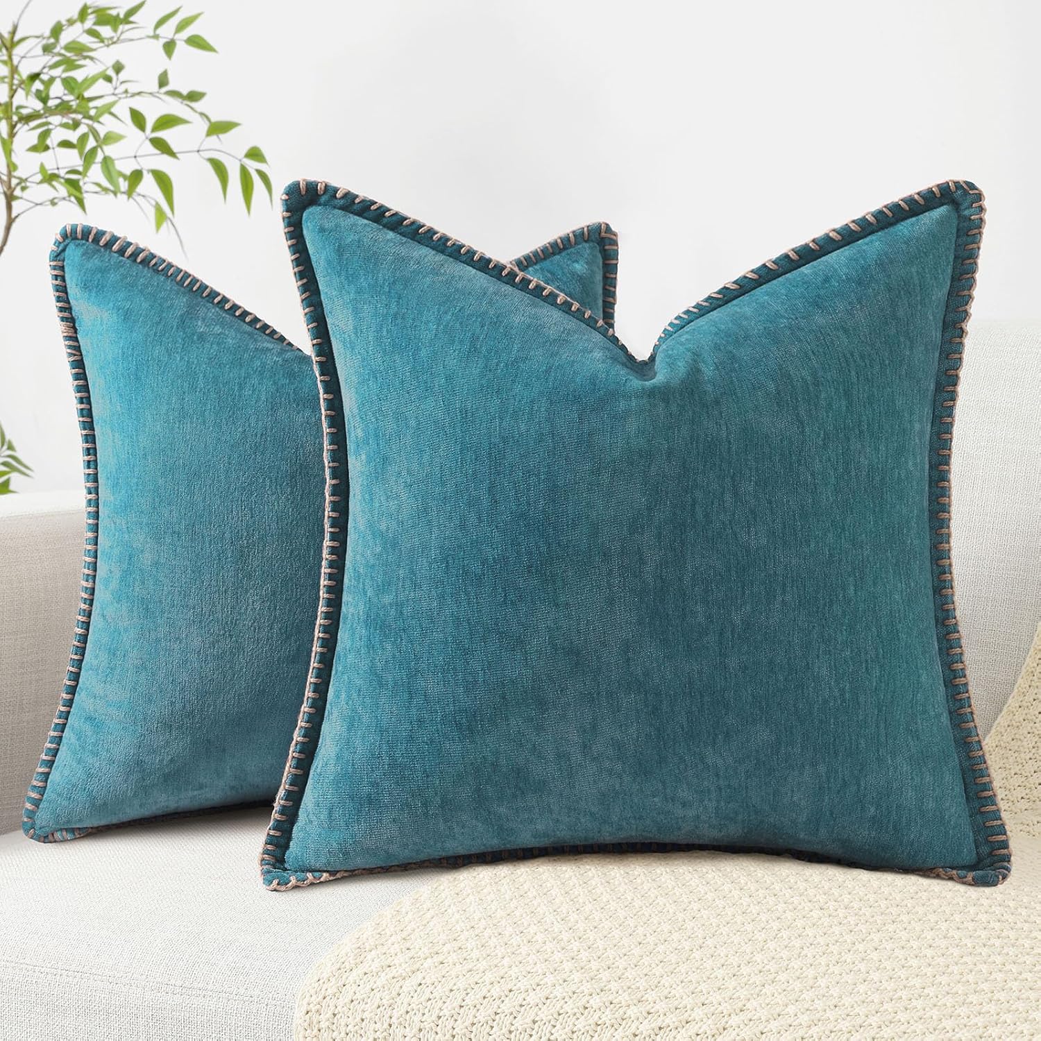 decorUhome Chenille Soft Throw Pillow Covers 16x16 Set of 2, Farmhouse Velvet Neutral Decorative Euro Pillow Covers with Stitched Edge for Couch Sofa Bed Home Decor, Teal