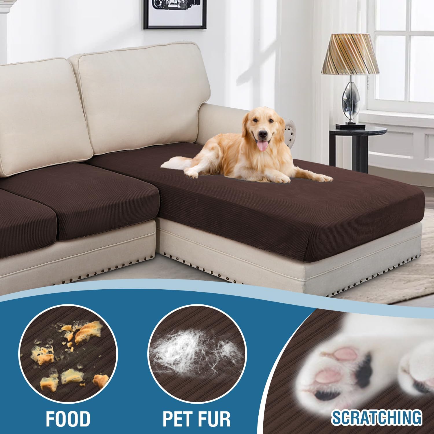 - INCREDIBLY COMFORTABLE VELVET: Products passed GLOBAL RECYCLED STANDARD certificate.This innovated stretch sofa slipcovers are constructed with 3 PIECES,including 1 Chaise cover and 2 individual cushion covers. Crafted from luxurious velvet plush fabric with unique striped cuts, feature thick, soft, smooth, anti-wrinkle, no fading, durable as well as highly stretch. Protect your cushion furniture from daily wears and tears, stains, kids, scratches from pet claws, dogs or accidental spills