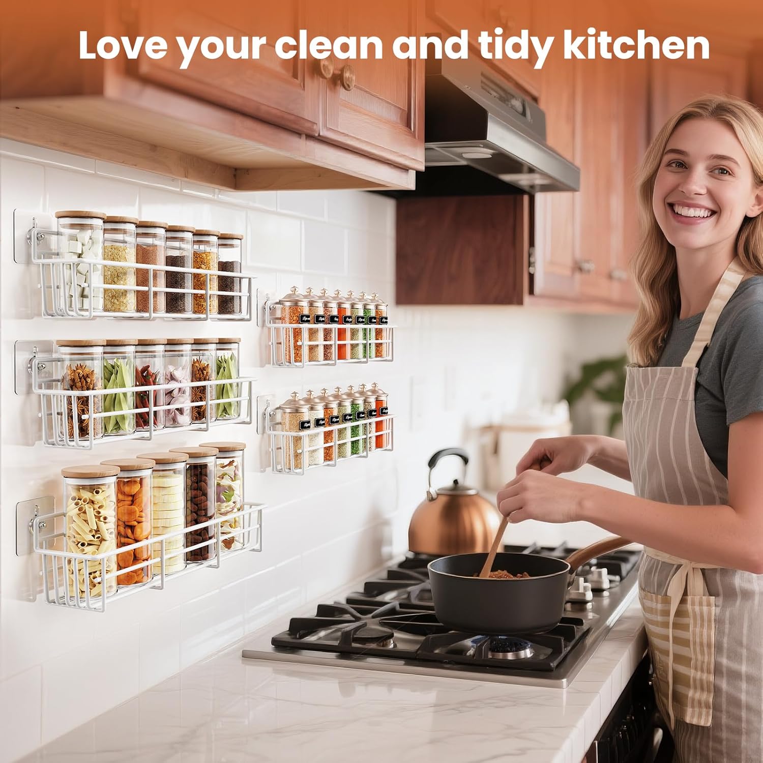 5 Pack Spice Rack Seasoning Organizer Wall Mount, Screw or Adhesive Hanging Shelf Basket Spice Organizer Shelf for Kitchen, White