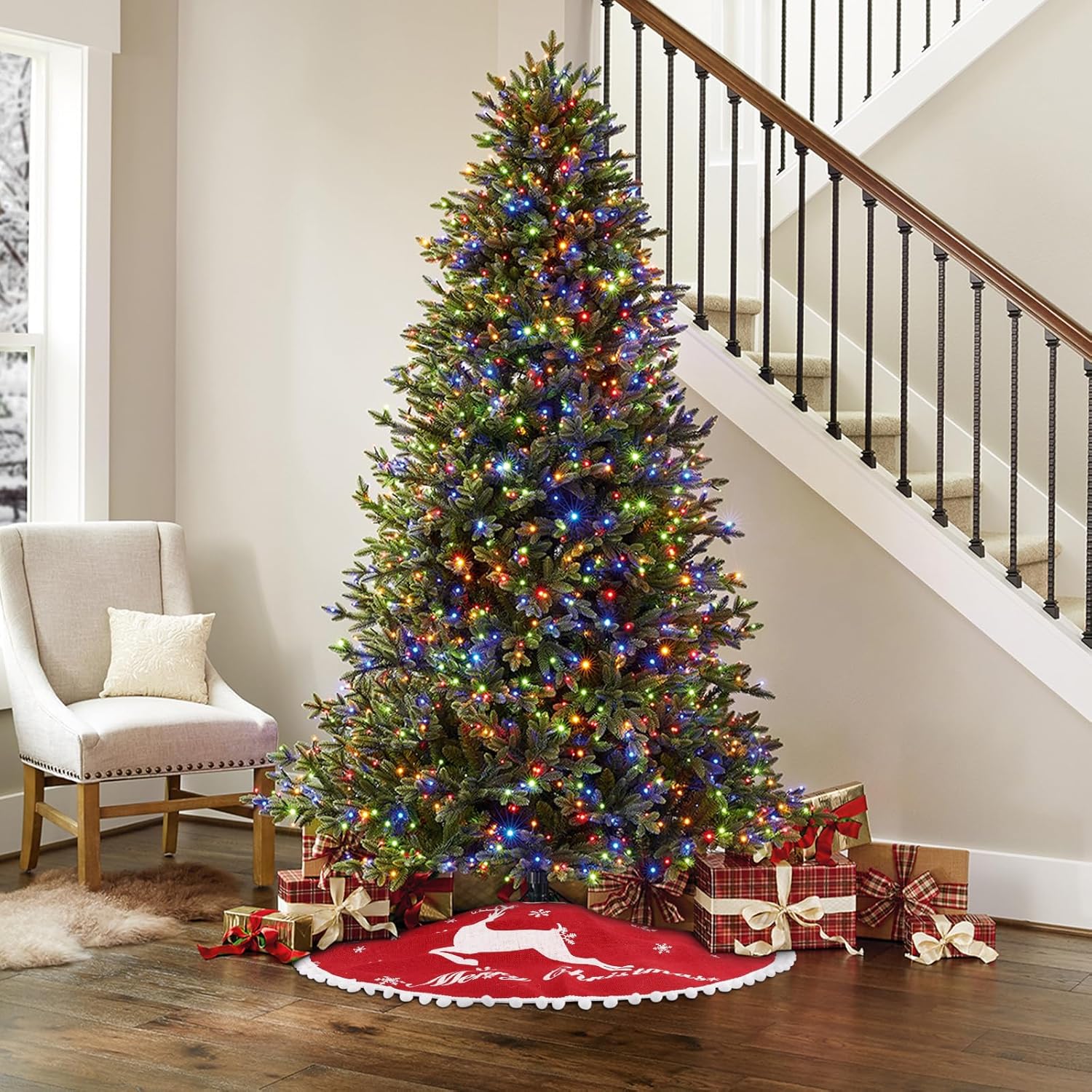- Merry Christmas Tree Skirt:Our Christmas tree skirts is printed with elk and various sizes of snow patterns, as well as the words "Merry Christmas." The edges are adorned with small, fluffy balls, adding a festive touch to your Christmas tree. This 24-inch tree skirt is perfectly sized for most Christmas trees perfectly. Before making a purchase, please measure the diameter of your tree to ensure a perfect fit