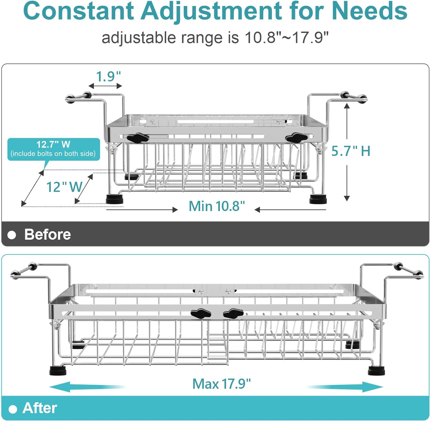 - Smart Expandable Design: Unlike basic racks, our in-sink dish rack expands its main body to hold 37% more dishes; Fits plates, bowls, and utensils effortlessly; Dimensions (excluding handles): 10.8–17.9" L x 12.7" W x 5.7" H; Includes a 12.8" x 11.2" sink protector for added versatility.