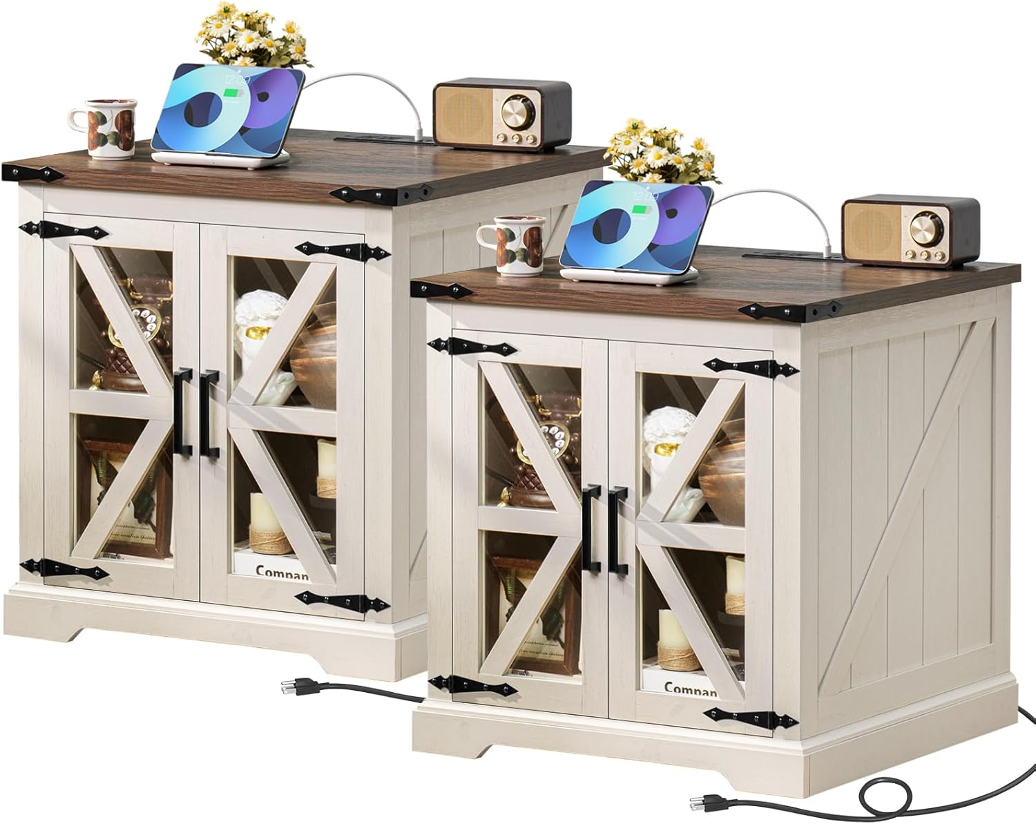 - š”[Farmhouse-Style end Table with Charging Station]This large end tables with generous storage is a perfect fusion of farmhouse and industrial metal styles. The exquisite barn-style tempered glass doors and the black metal corner accents add an elegant touch to the cabinet body, making it visually captivating from any angle.
