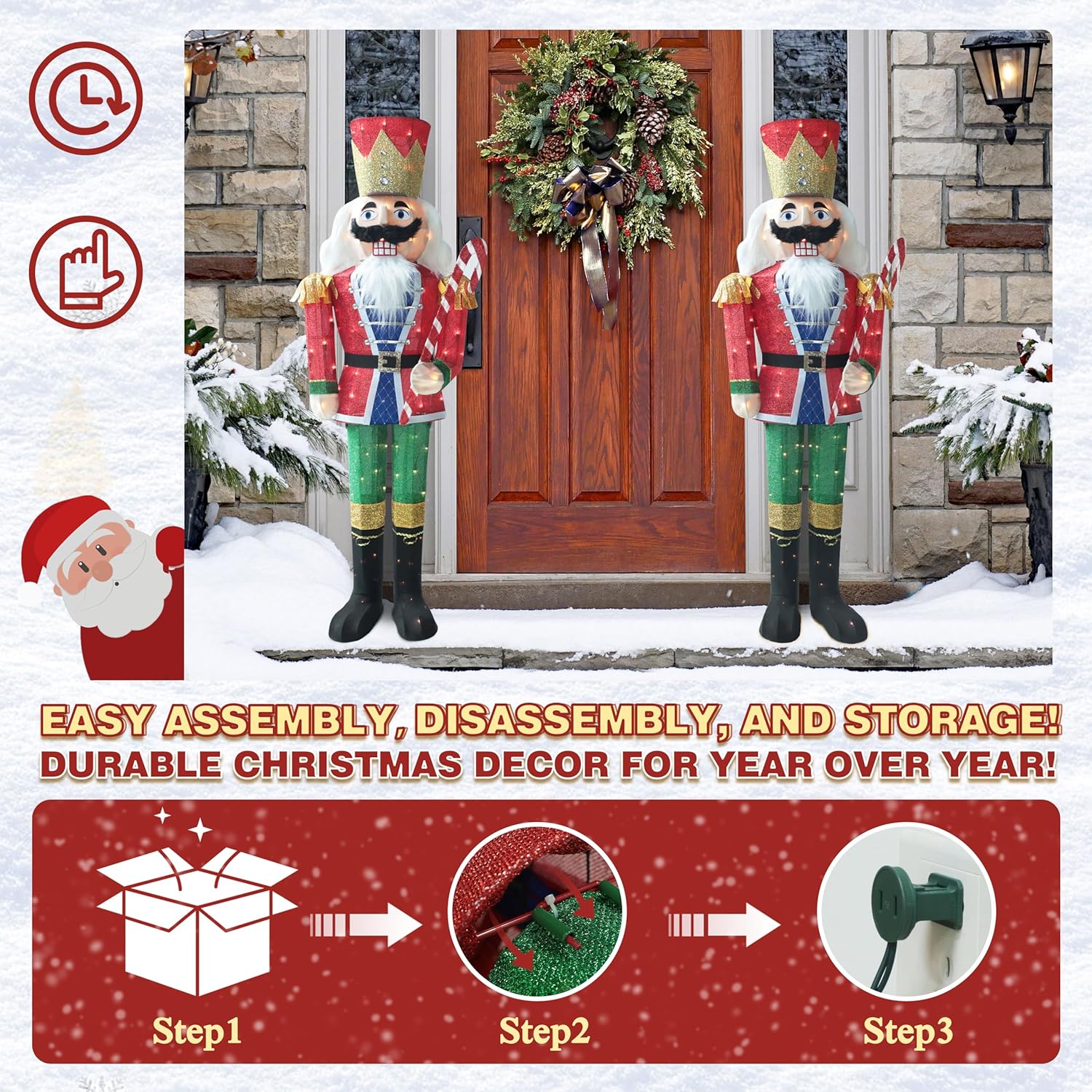 - [Easy to Assembly] It only takes 3 steps to assembly. Step 1: Take out all the items from the package. Step 2: Assemble it according to the instructions. Step 3: Plug in the socket to light it up. If you are going to use this nutcracker for outdoor, donāt forget the ground stakes included that will make it well fixed on the ground.
