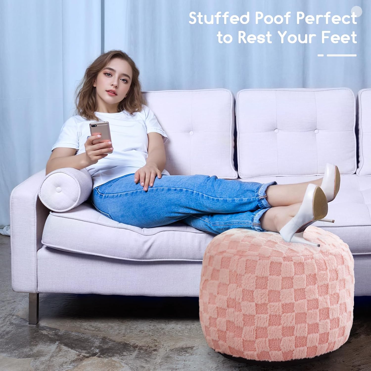 - The HIGOGOGO pouf ottoman with a soft and plaid outer layer and full filling, making it perfect for use as an ottoman foot rest or seat cushion.20x20x15 inch size, this ottoman pouf is versatile enough for use with a coffee table, side table, or floor cushion in any room of the house.