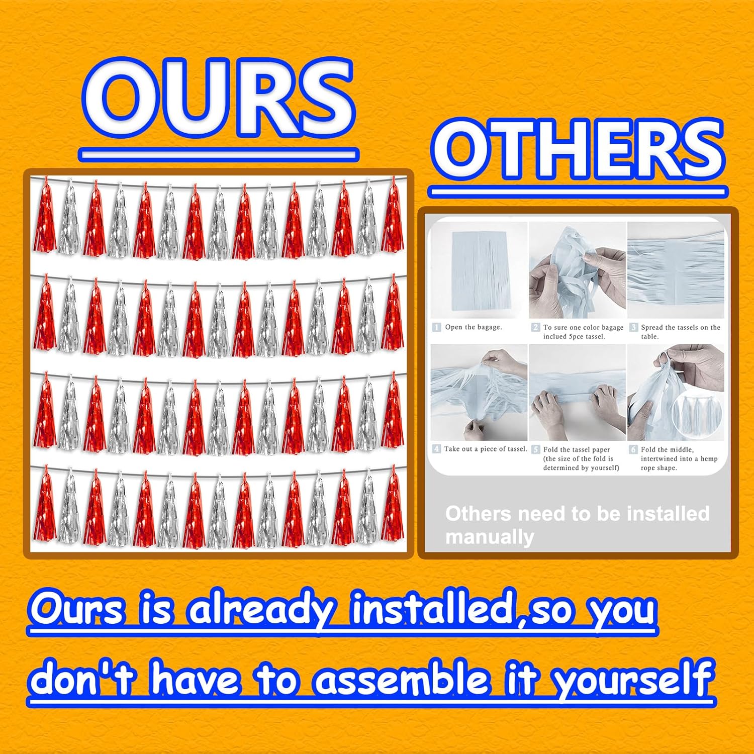 - 【Red Silver Party Supplies Set】: The total length of the Red Silver birthday tassels banner is 39.2 feet 60tassels, divided into 4 strips, each 9.8 feet long. Each banner contains 15 tassels, and each tassel measures 14 inches, for birthday decorations many occasions, and so on