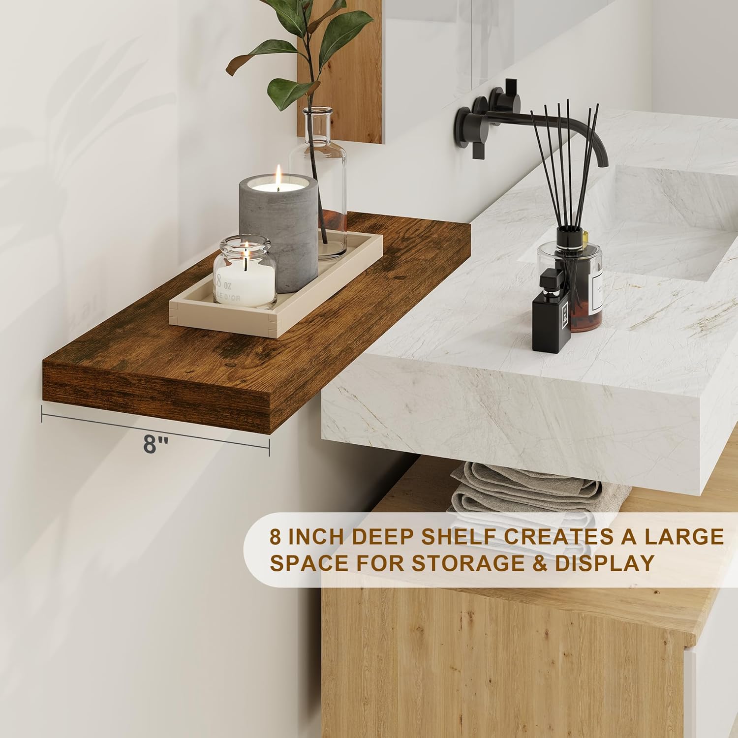 - 【8 INCH DEEP FLOATING SHELF】This extra deeper and thicker wall shelves are 8 inches in depth and 1.4 inches in thickness instead of the regular narrow floating shelves, you can put photos, pictures, DVD players, videos, books, toys, and some other knickknack on this beautiful display wooden shelf.