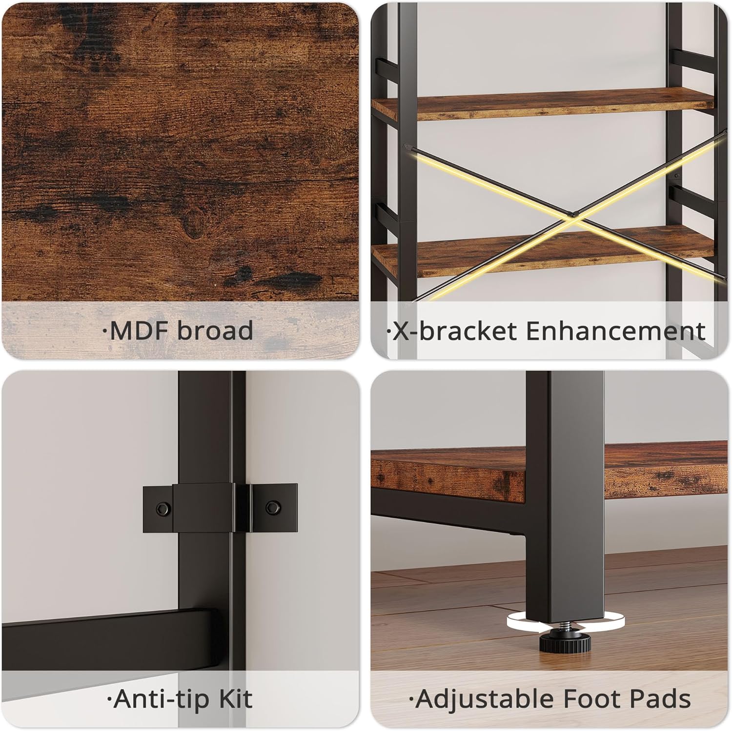 - Anti-Tip Kit: Tipover Resistance Device and 4 adjustable floor protective footpads are included for safety. These features provide added stability and prevent the bookshelf from tipping over, protecting your belongings from damage