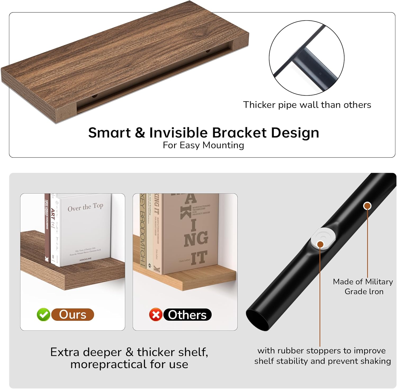 - Extra Deeper & Thicker - Each board measures 24"W x 9"D x 1.6"H. Extra deeper and thicker design in order to bring maximizes storage space and weight capacity, even hold up to 50 lb each. This floating shelf taking up zero square feet, reduces clutter and highlights décor in compact spaces.