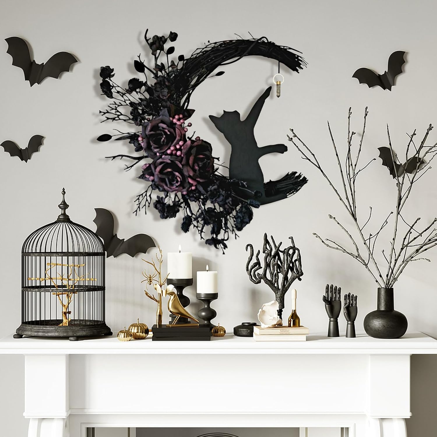 - Halloween Wreath Decorations: 2025 moon cat black halloween wreaths for front door adopts classic black cat, moon, rattan and roses Halloween elements! "Look, there's a kitten standing up and trying to touch the moon"! Very fun, create a mysterious and scary Halloween atmosphere for your home