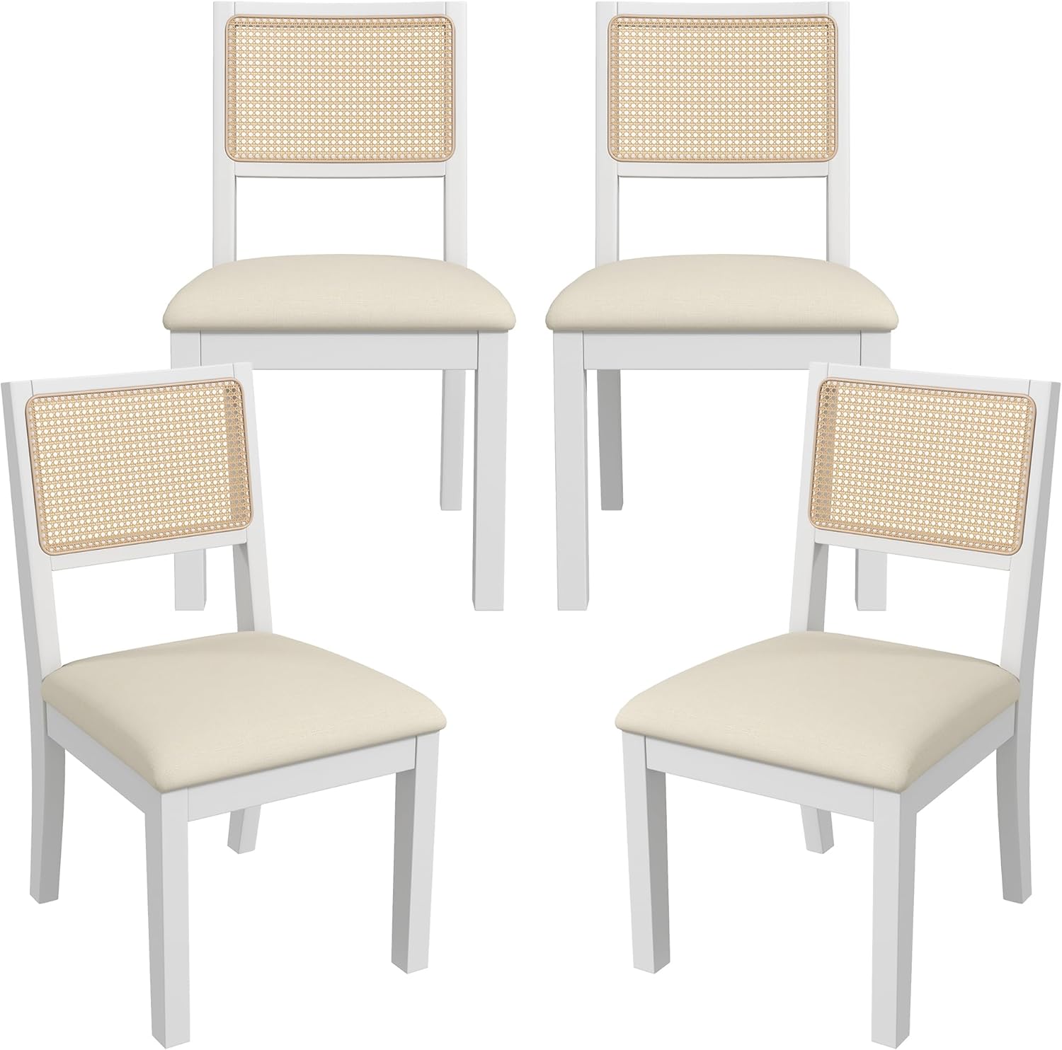 Westice Rattan Dining Chairs Set of 4, Farmhouse Natural Dining Room Chairs with Upholstered Cushion, Wood Armless Chairs for Kitchen/Restaurant, White