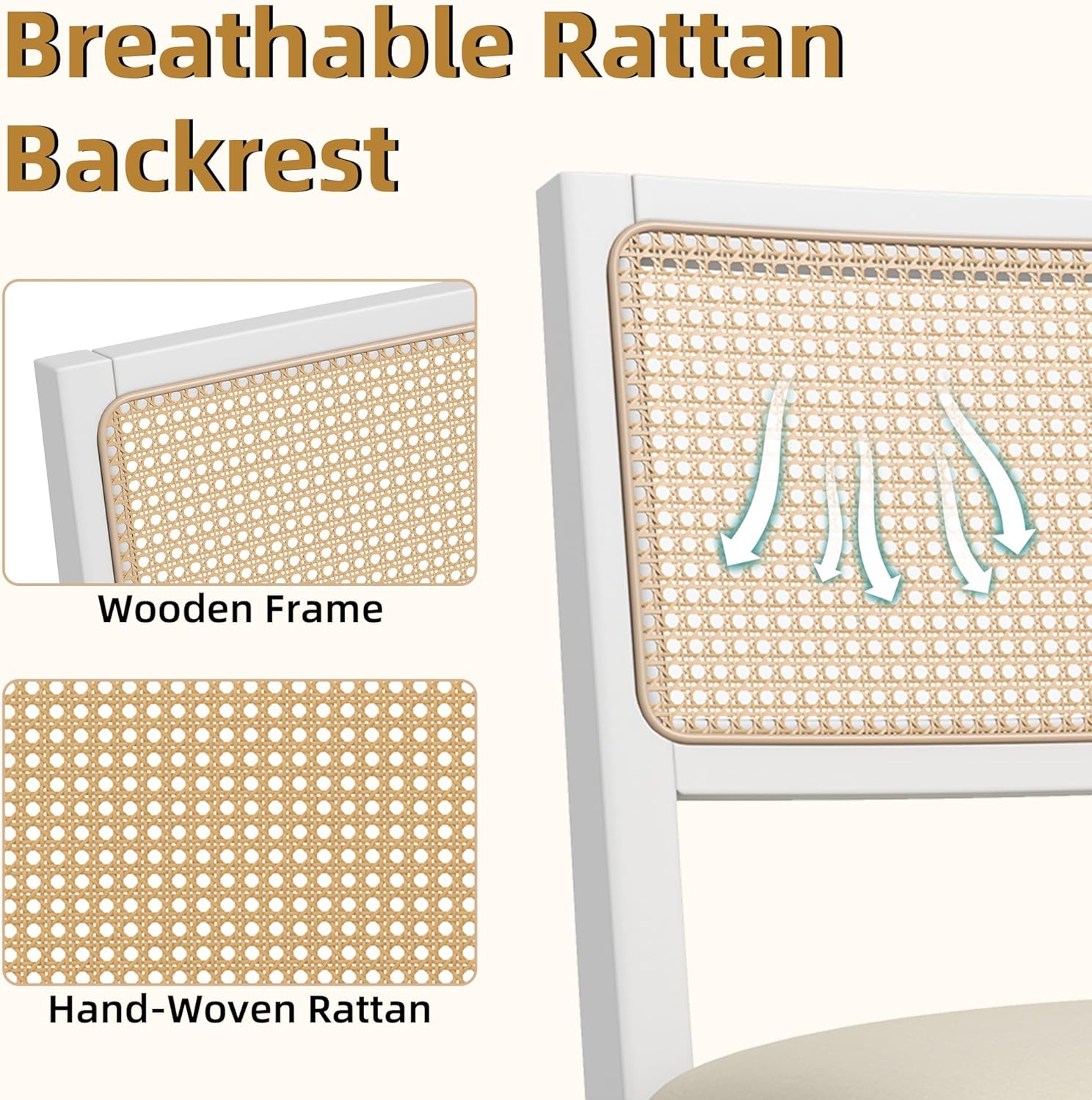- ćBreathable Rattan BackćThe hand-woven kitchen chairs with a natural open-weave design and rattan back promote good airflow, making them exceptionally comfortable, especially in warmer climates. The inherent flexibility of rattan adds a gentle give, further enhancing seating comfort