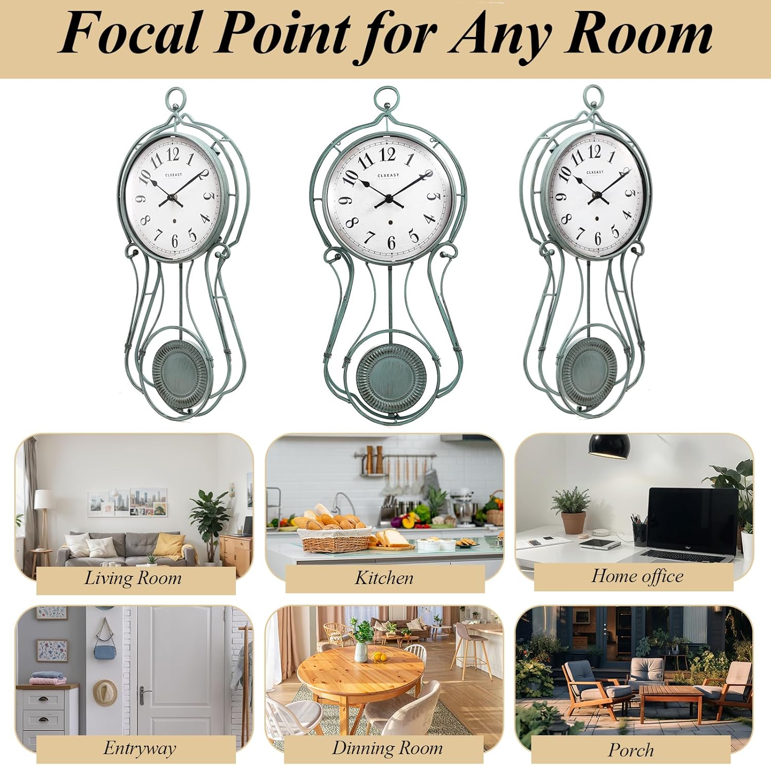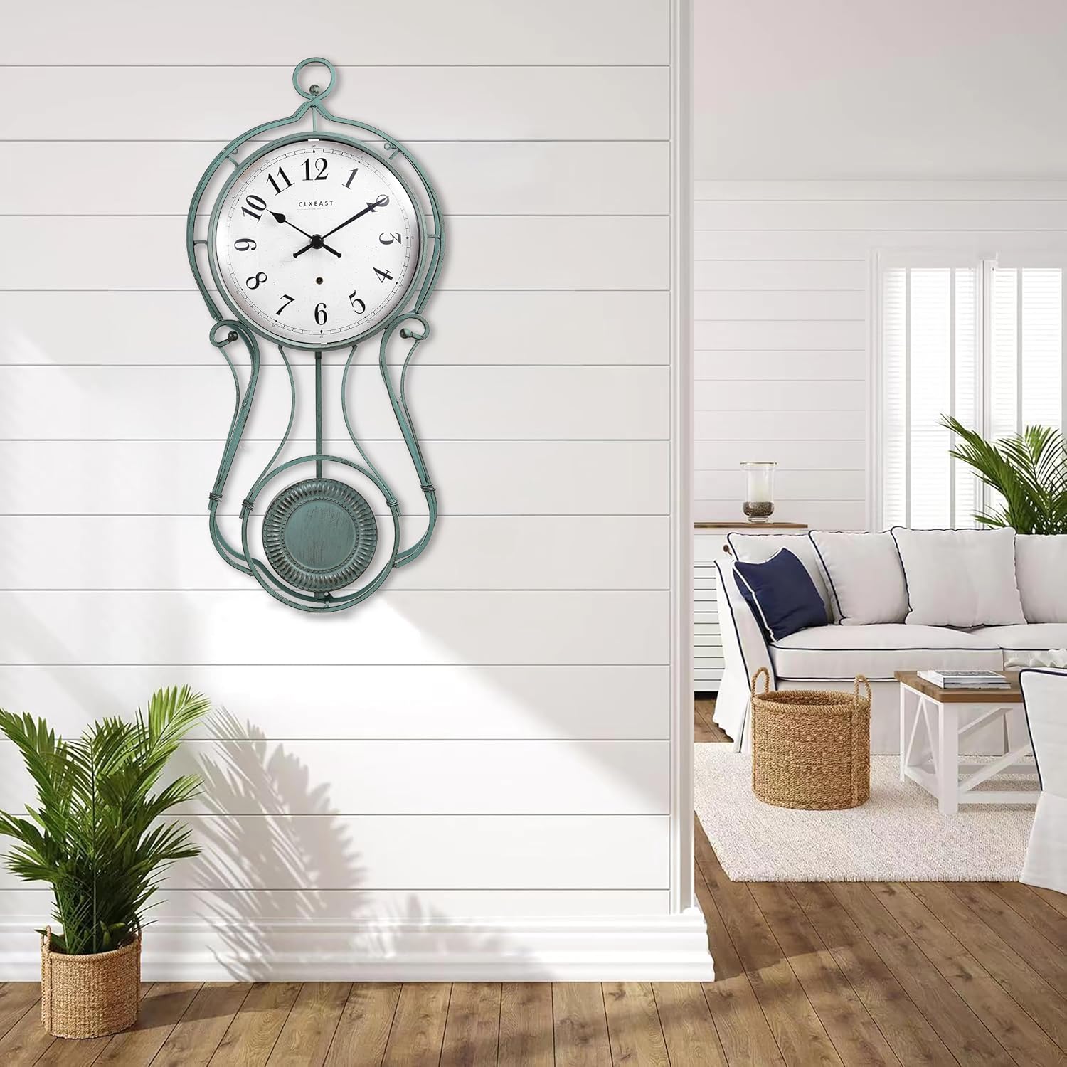 - [Focal Point in Any Space]- Measures Size 20"H x 2.4"D x 9.2"W,this antique aged teal green pendulum wall clock is suitable for varieties of architectural decor style, perfect to decorative for your kitchen, dining room, living room, porch,hallway,fence, above a fireplace, coffee house, Home office,Entryway&Laundry,Farmhouse living room