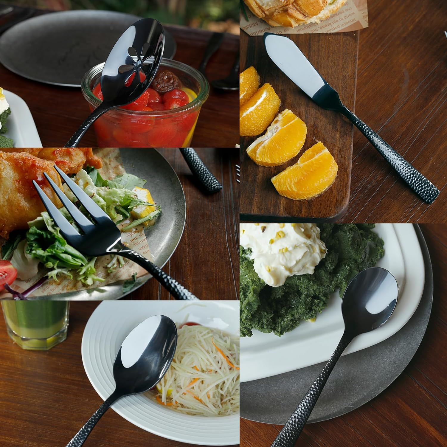 - 【APPEARANCE AND DESIGN】Shiny black color and mirror polish, unique design with hammered handle, dishwasher safe