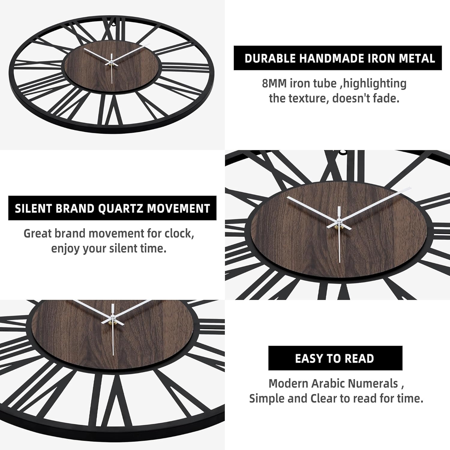 - [Quality Hndmade Clock] -The large black metal clock has a wood face-out retro design. The strength and retro appearance of the Big Number wall clock are ensured by the use of high-quality 2cm thicker handmade iron materials in the handcrafted, metal frame and showing the wooden face.