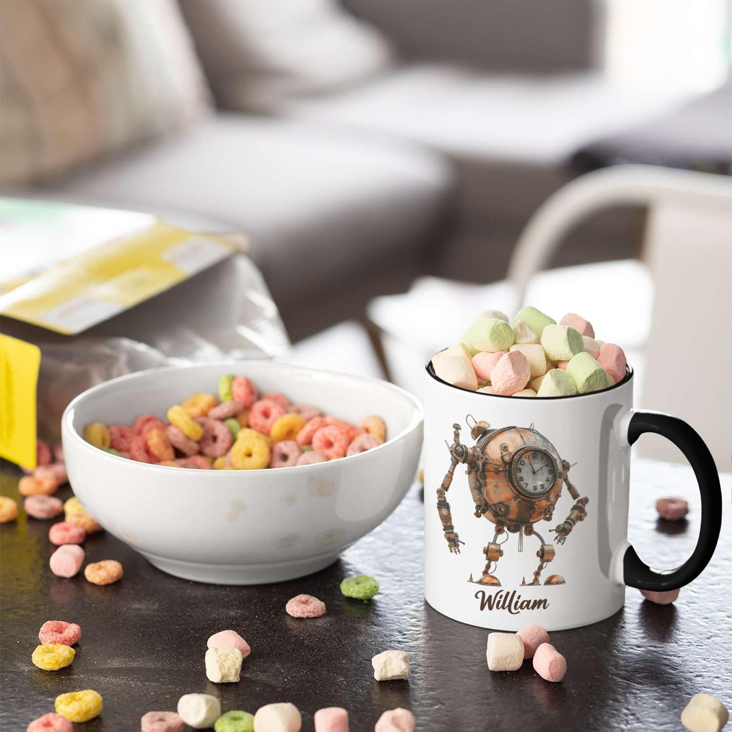Steampunk Robot Coffee Mug With Custom Name, Customized Mechanical Themed Design Ceramic Cup, Steampunk Enthusiasts White Cup 11oz Or 15oz, Personalized Mug Gift For Daughter Son