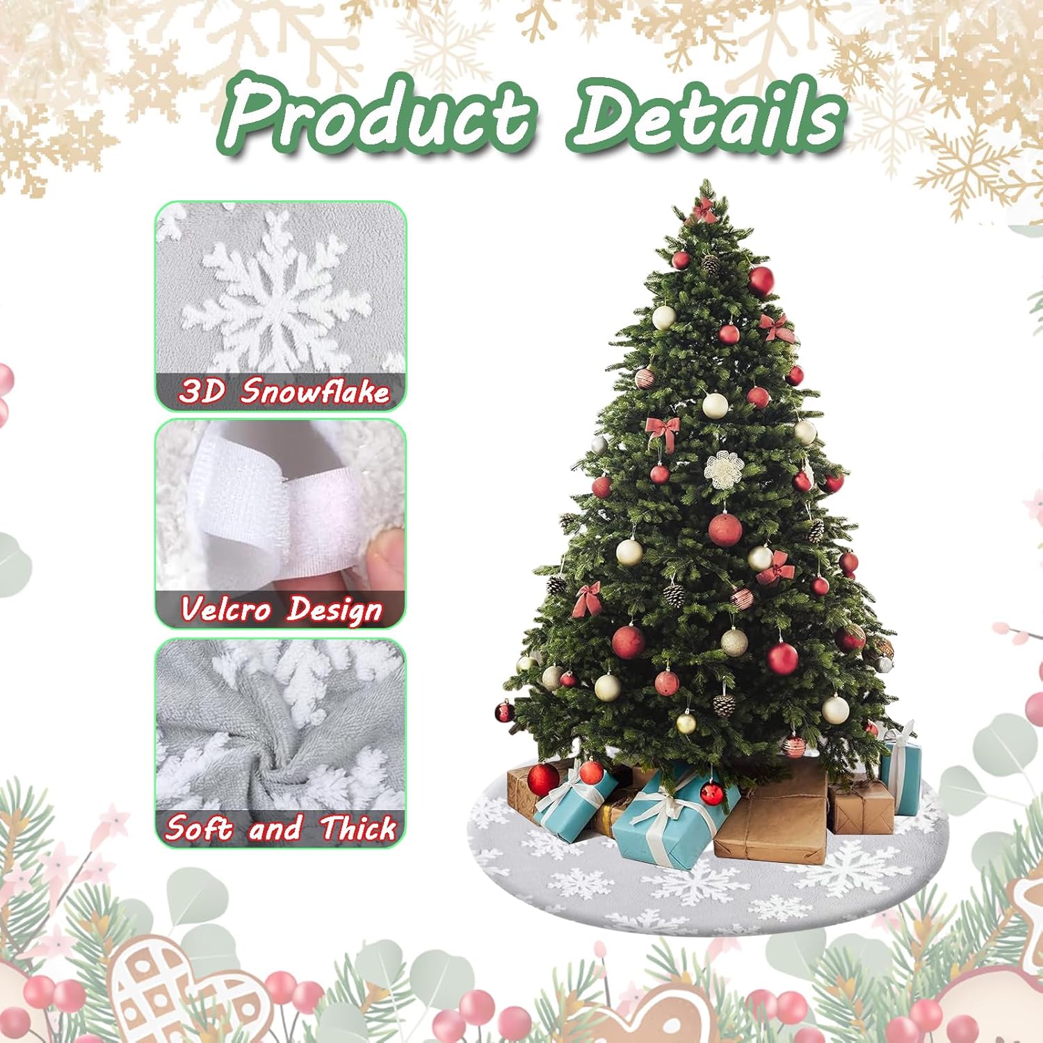 - 🎄 🎄 【Luxurious 3D large snowflakes】 - The beautiful tree skirt is designed with a handmade 3D large snowflake create a wonderful, magical effect. Grey plush and White snowflakes create a perfect Christmas scene.