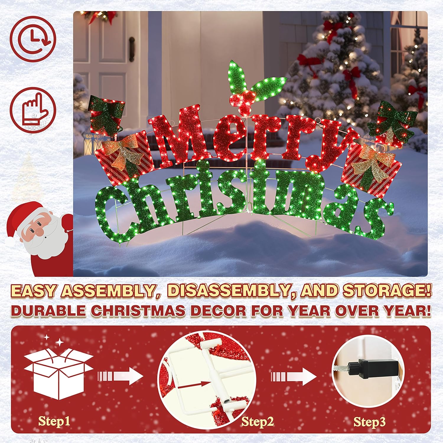 - Easy to Assembly: It only takes 3 steps to assembly. Step 1: Take out all the items from the package. Step 2: Assemble it according to the instructions. Step 3: Plug in the socket to light it up. If you are going to use this Merry Christmas sign on the ground, donā t forget the ground stakes included that will make it well fixed