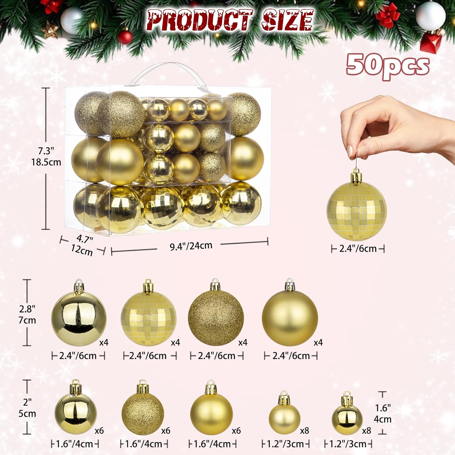 50pcs Gold Christmas Ball Ornaments Large Shatterproof Christmas Tree Decorations Xmas Tree Ornaments Balls with Hanging Loop for Xmas Wedding Holiday Party Wreath Home Decor