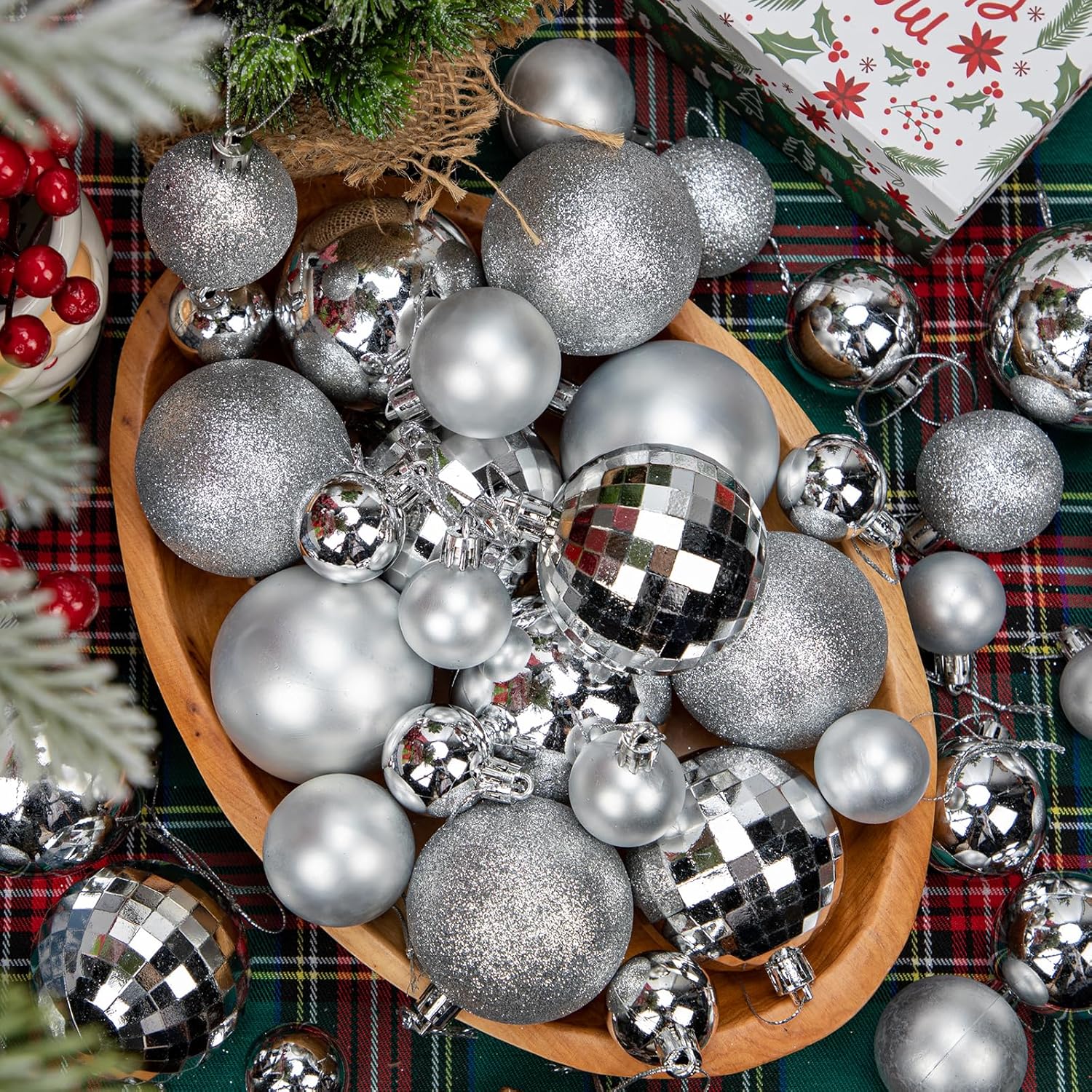 - Easy to Use: Each hanging silver Christmas ball ornament equips a hook with string for you to hang it easily. Perfect fit for any normal size tree, give yourself a perfect space, hang anywhere you like. Such as tree branches, gate, fence, banister, etc. Create a warm and harmonious atmosphere